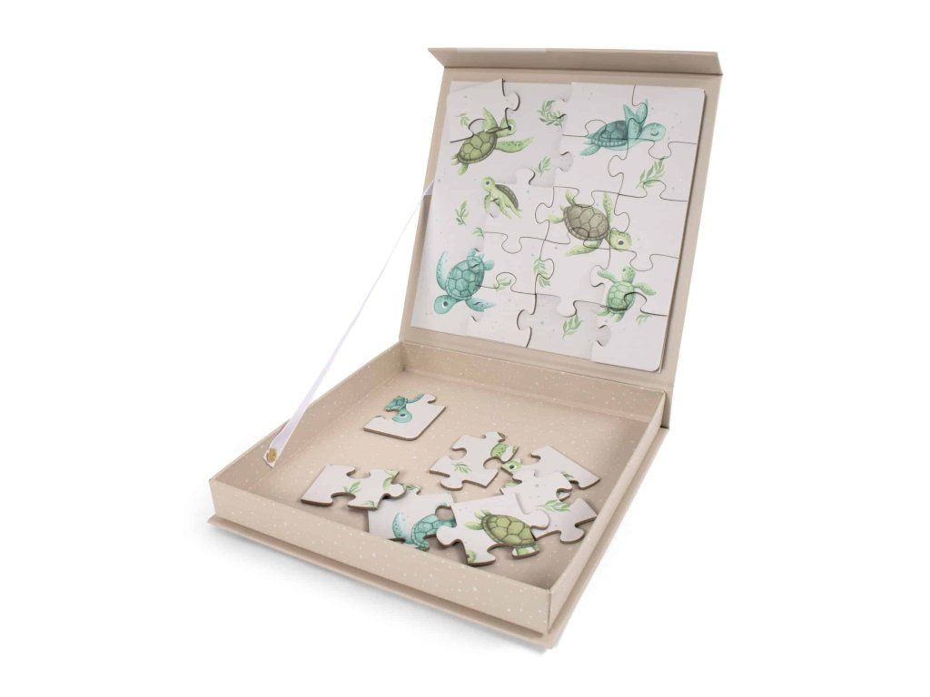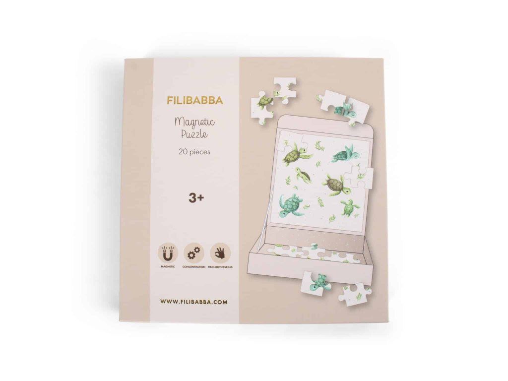 Vložiť posledný kúsok skladačky na miesto je úžasný, bez ohľadu na to, kde sa nachádzate. Magnetická logická hra s roztomilými korytnačkami prináša skutočnú puzzle zábavu na cestách a vďaka peknej krabičke s pripojenou magnetickou doskou puzzle zostanú vaše dieliky puzzle na svojom mieste. Praktické magnetické puzzle s farebnými, ručne kreslenými morskými živočíchmi trénuje jemnú motoriku vášho dieťaťa a pomáha upokojiť sa po náročnom dni. Táto hra je vhodná od troch rokov a zamiluje si ju celá rodina.Dodatočné parametre