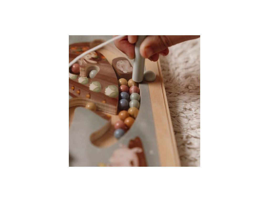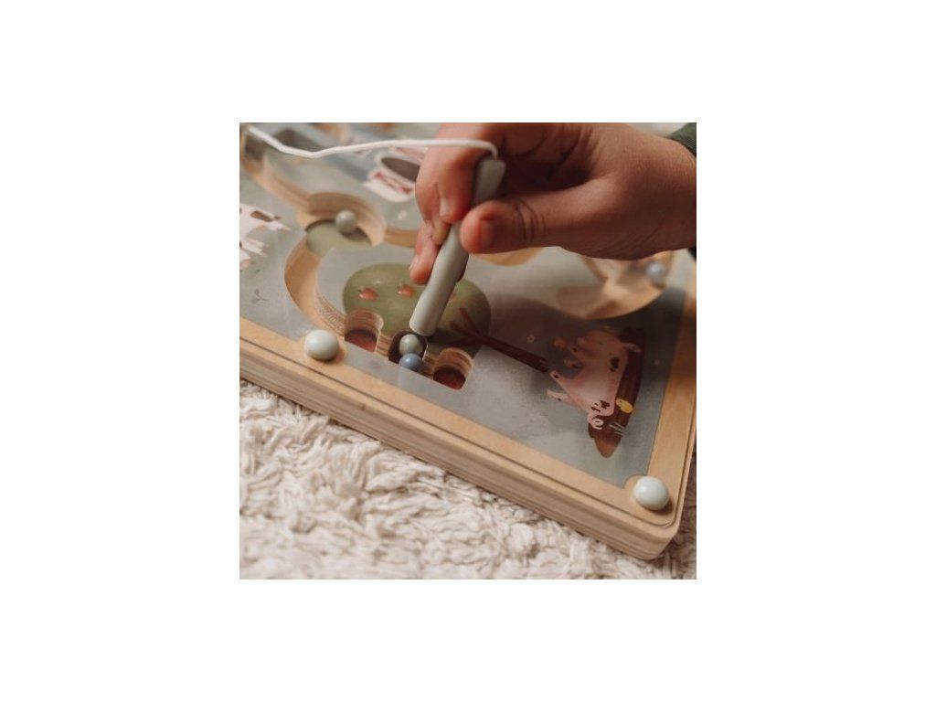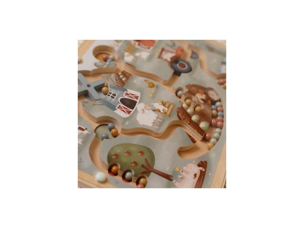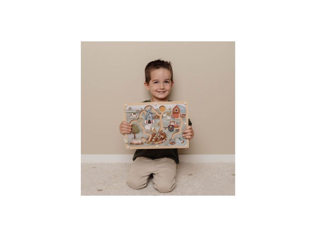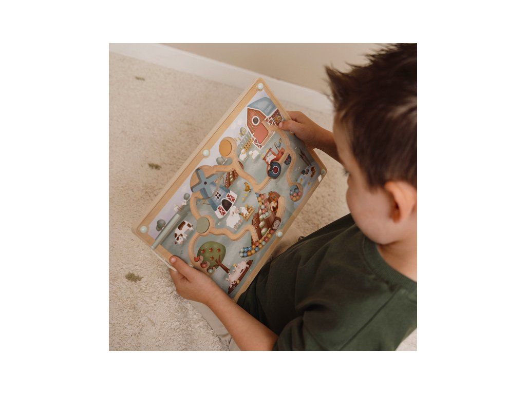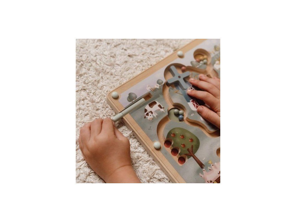 Originálna hračka s magnetickým perom, ktorým sa posúvajú farebné guličky dráhami dreveného bludiska s krásnymi ilustráciami zo života na farme. Môžete sa napríklad s vašim dieťaťom rozhodnúť, že všetky modré guličky presunie do jazierka a dve červené guličky presunie na jabloň. Cestou bude potrebné prekonať aj prekážky, ako je otočné koleso traktora alebo lopatky veterného mlyna. Ilustrácia nabáda aj k vymýšľaniu príbehov zo života na farme.