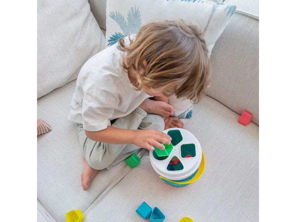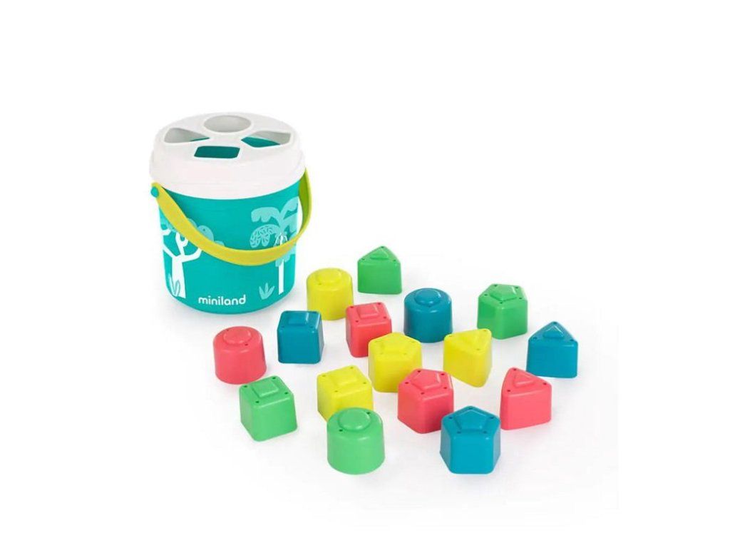 Sada obsahuje 16 farebných prvkov v 4 základných tvaroch: kruh, trojuholník, štvorec a päťuholník. Dieťa sa učí vkladať správne tvary do zodpovedajúcich otvorov na veku vedierka. Tento proces prirodzene rozvíja kľúčové zručnosti: