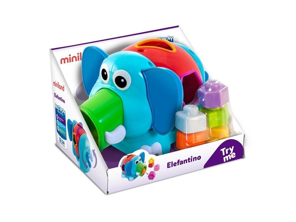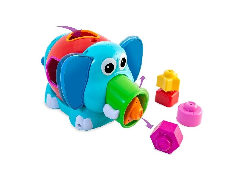 Ponúka množstvo možností.Keď stlačíte uši slona, cez jeho sosák sa dostane von predtým hodená kocka. Slon otáča chvostom a jeho trup sa tiež otáča, čím sa menia tvary pre kocky, ktoré sa vkladajú do otvoru. Počas hry sloník dieťa zaujme aj hrkajúcimi zvukmi. 5 kociek v rôznych geometrických tvaroch môže byť naskladaných na seba, aby vytvorili bezpečnú pyramídu. Rôzne farby pomôžu rozvíjať schopnosť dieťaťa rozlíšiť farby a tvary.