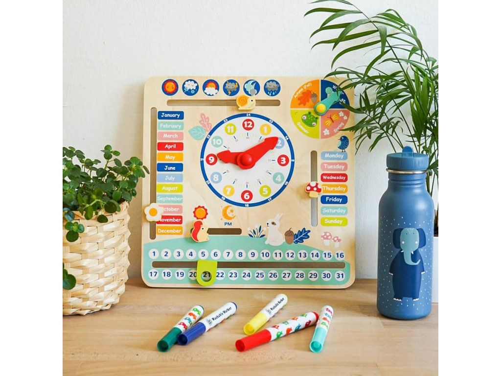 Môj kalendár Koľko je hodín? Nádherný drevený kalendár je úžasnou edukačnou pomôckou pre deti a taktiež aj skvelým dizajnovým doplnkom do detskej izbičky. Deti sa učia čas prostredníctvom ručičkových hodín, môžu si tiež v kalendári poznačiť, aký je mesiac, dátum, aké je počasie alebo či je doobedie či poobedie.Deti získavajú pojem o čase. Učia sa orientovať v rôznych častiach dňa, mesiaca a roku. Vďaka tomu si zlepšujú aj matematické schopnosti a logické myslenie. Vzdelávacia hračka je vysoko kvalitná, vyrobená s ohľadom na životné prostredie a bezpečnosť dieťaťa.Dodatočné parametre