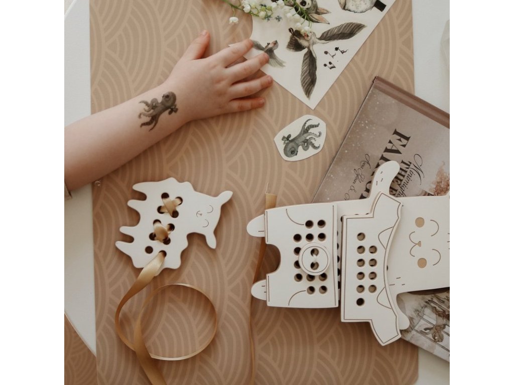 - drevená provliekacia hračka pre rozvoj kreativity, fantázie a jemnej motoriky