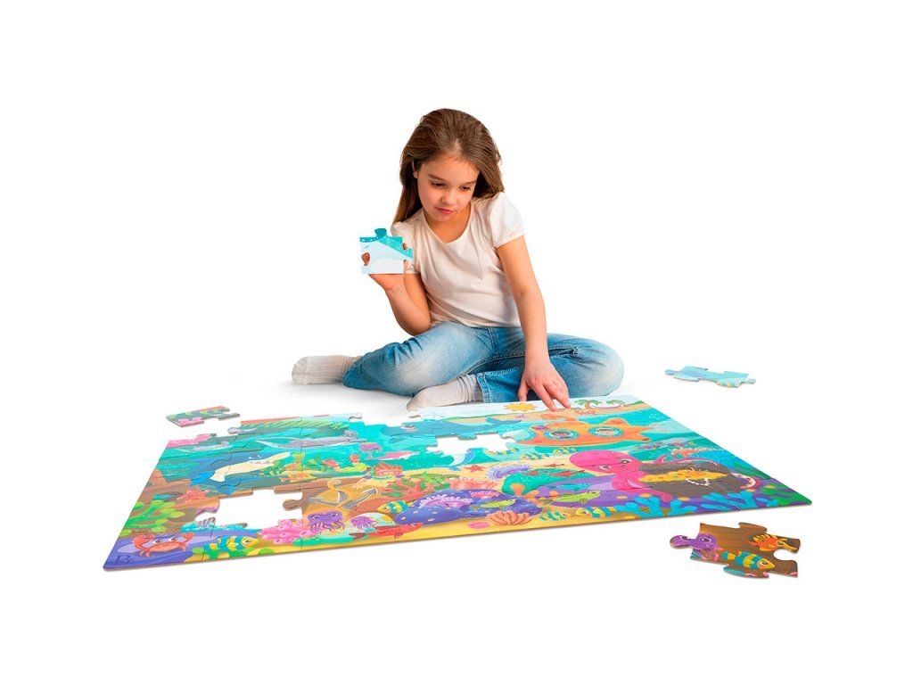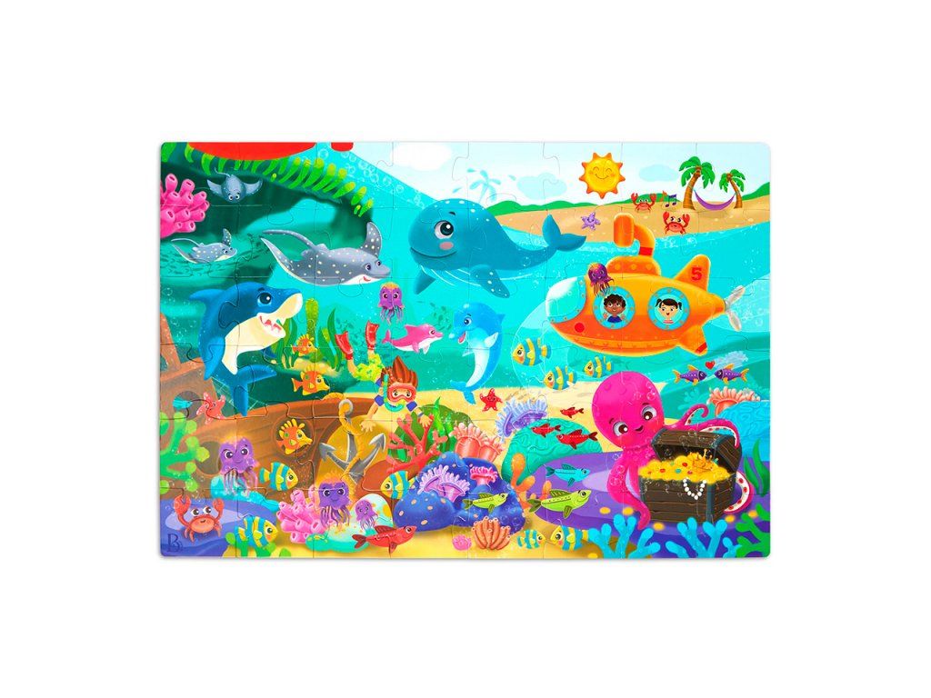 Pripravte sa na cestu do sveta pod morskou hladinou s maxi puzzle s krásnymi ilustráciami morského dna a jeho usmievavých obyvateľov! Extra veľké diely z pevného kartónu tvoria plochu 91,4 x 60,9 cm a sú tak ideálne na skladanie na podlahe.