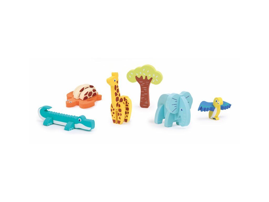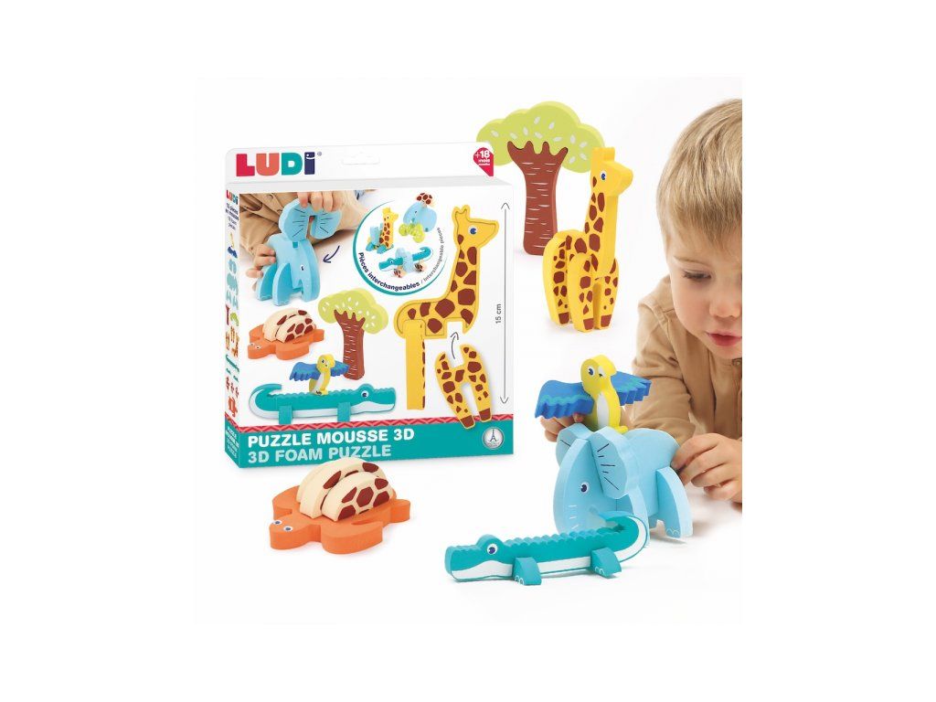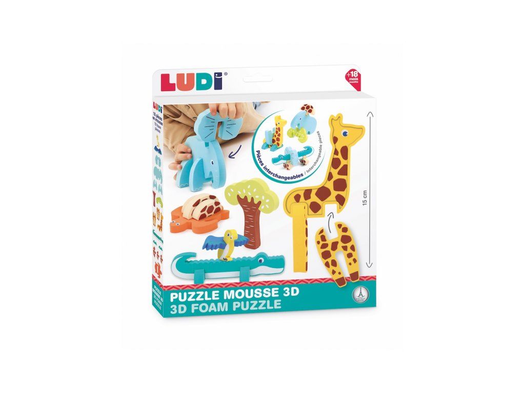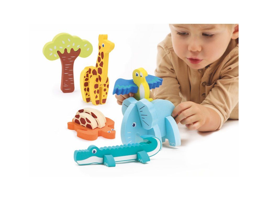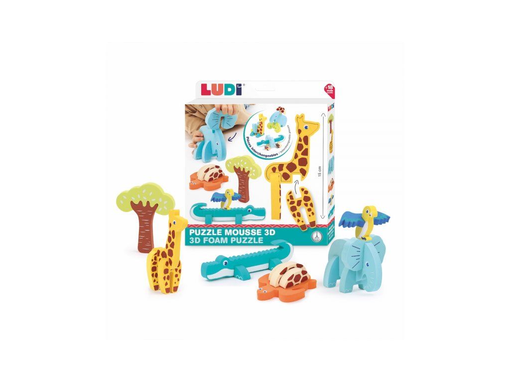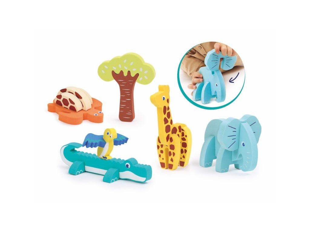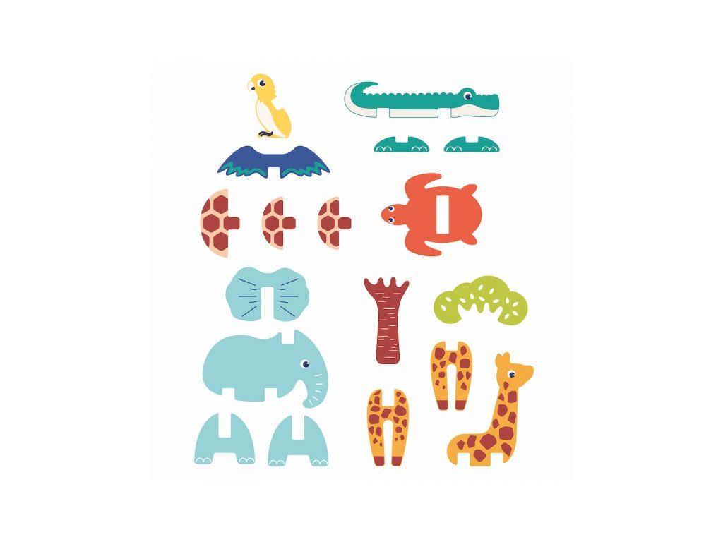 Originálne trojrozmerné penové puzzle pre najmenších umožňuje zostaviť slona, krokodíla, žirafu, korytnačku, papagája a strom. Jednotlivé diely z mäkkej, odolnej peny do seba ľahko zapadajú, takže aj veľmi malé deti dokážu zvieratká zostaviť.