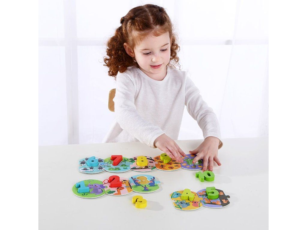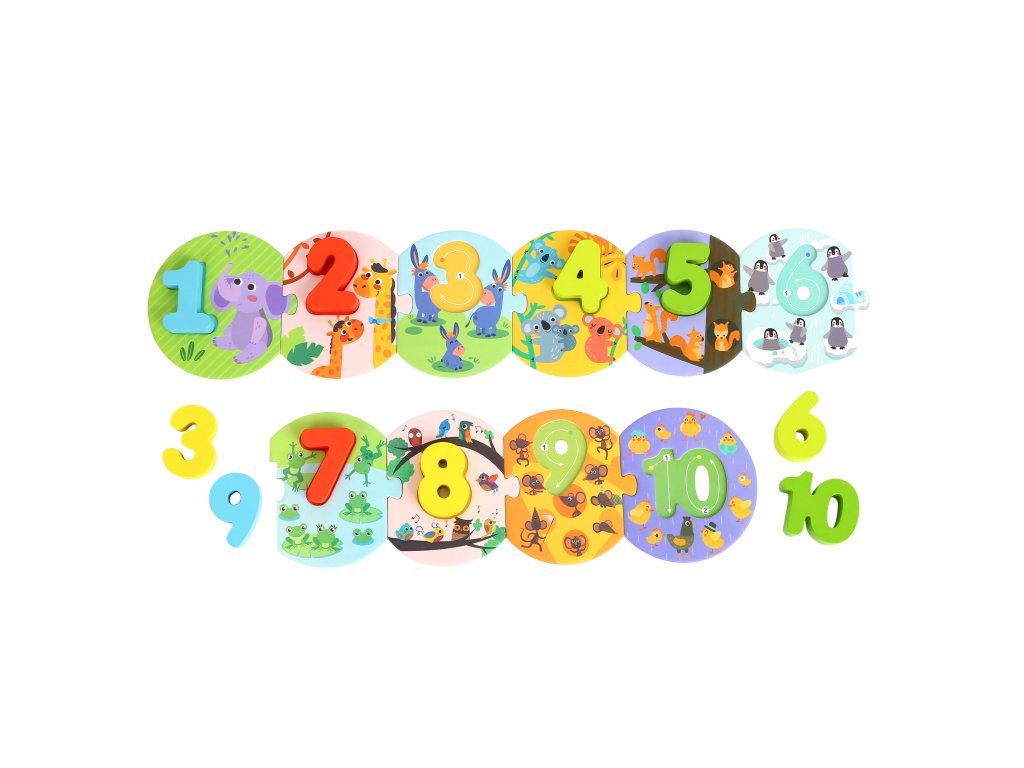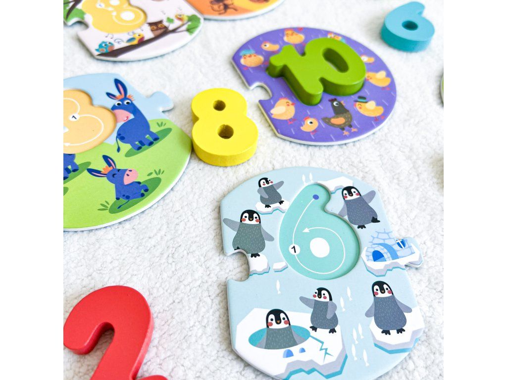 Puzzle Priraď ČíslaUčenie čísel s trpezlivosťou a úsmevomDrevené puzzle s motívom zvieratiek a čísel vám umožňujú spojiť zábavu s učením: deti skladajú číselný rad od 1 po 10, počítajú zvieratká a vkladajú správne čísla do otvorov. Skvelý spôsob ako podporiť motoriku, logiku a prvé matematické kroky.Malé dieliky, veľké matematické začiatkyObsahuje 10 dielikov s obrázkami zvieratiek + 10 drevených čísiel – ide o kompletný číselný rad. Veľké dieliky vhodné pre malé ruky — dieťa ich ľahko uchopí a manipulácia mu nerobí problém. Pomáha rozvíjať jemnú motoriku, logické myslenie a schopnosť počítania do desať – všetko prostredníctvom hry. Vhodné pre deti od približne 2 rokov – ideálne ako prvé puzzle a edukačná hračka. Vyrobené z kvalitného dreva a netoxických farieb – bezpečné pre detské hranie.Dodatočné parametre