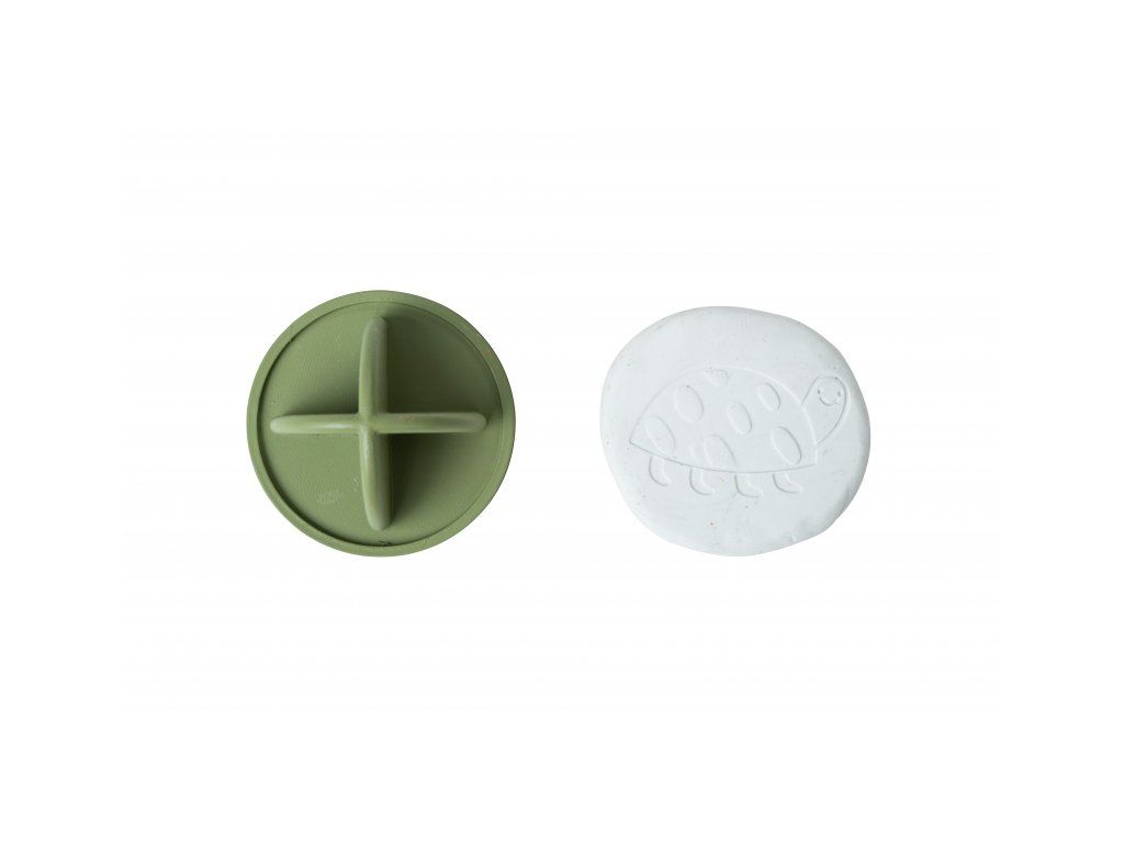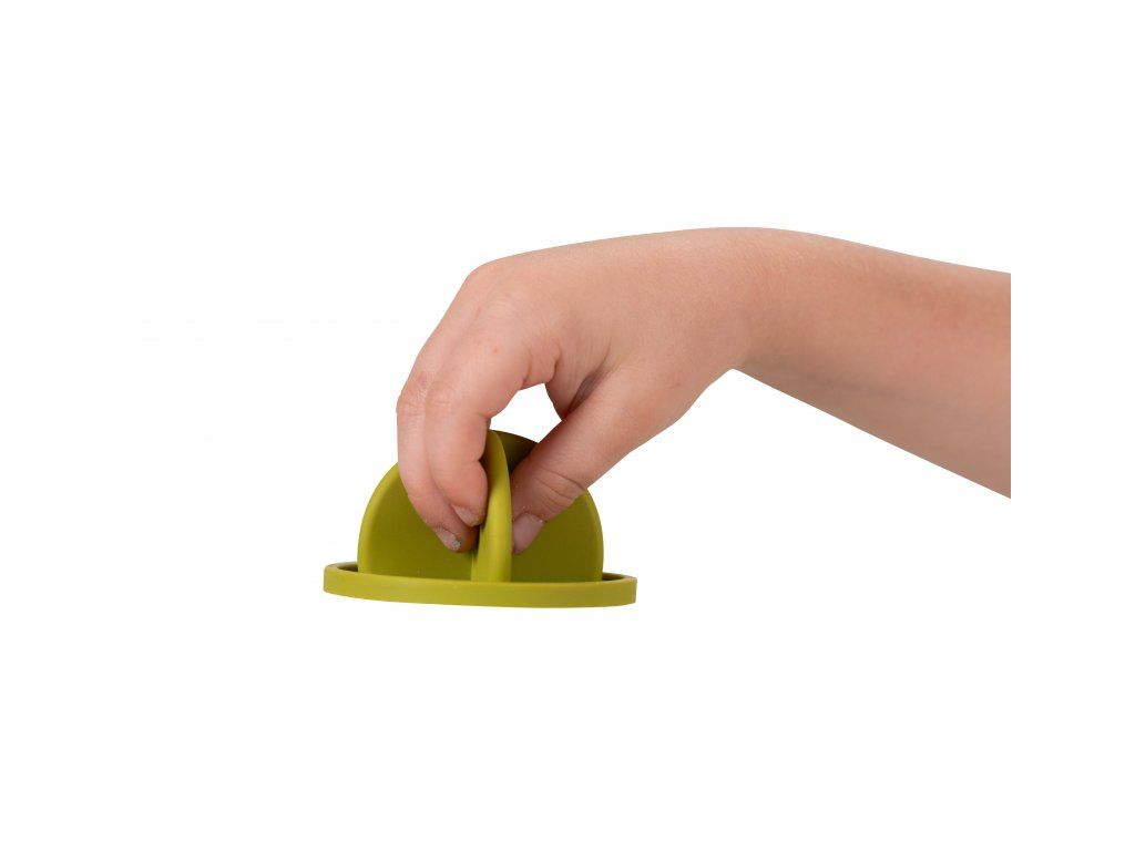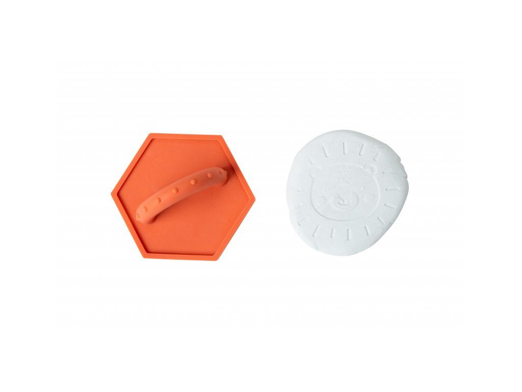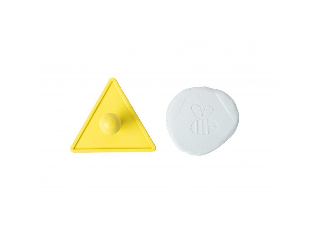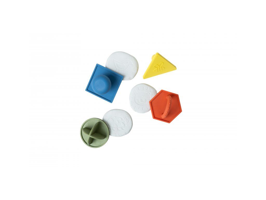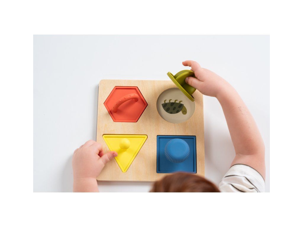 Sada obsahuje drevenú základňu, 4 silikónové vkladacie tvary s úchytmi a 2 obojstranné karty s ilustráciami (farby, zvieratká, ovocie a počty).