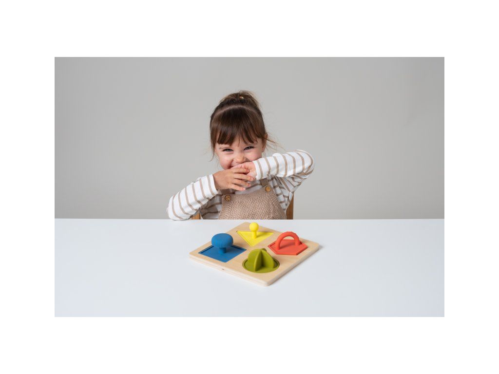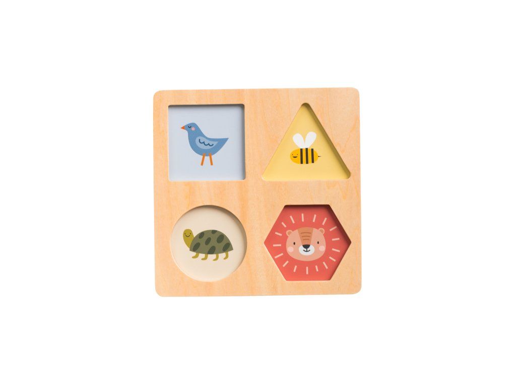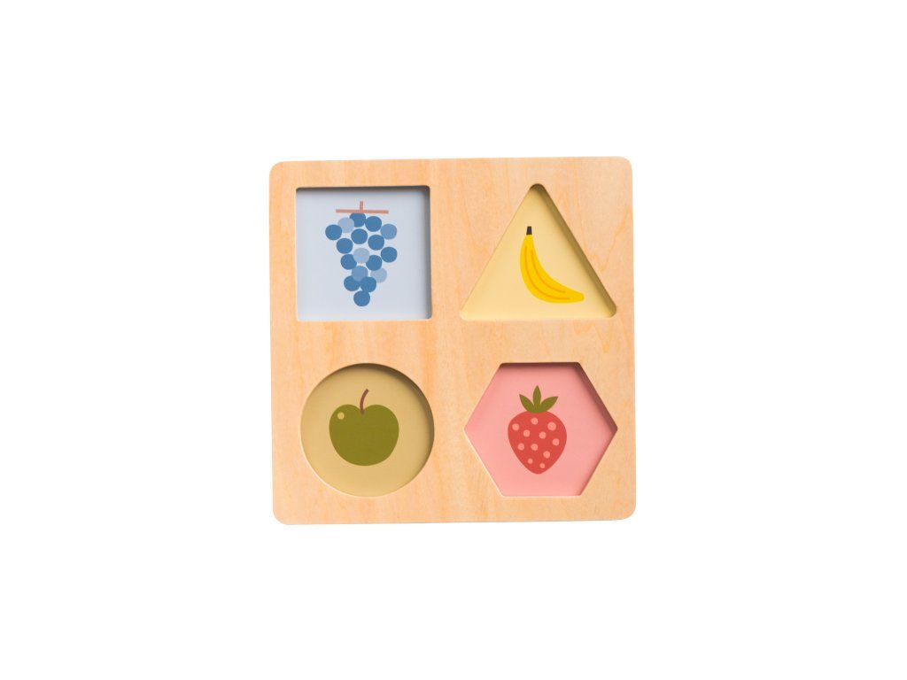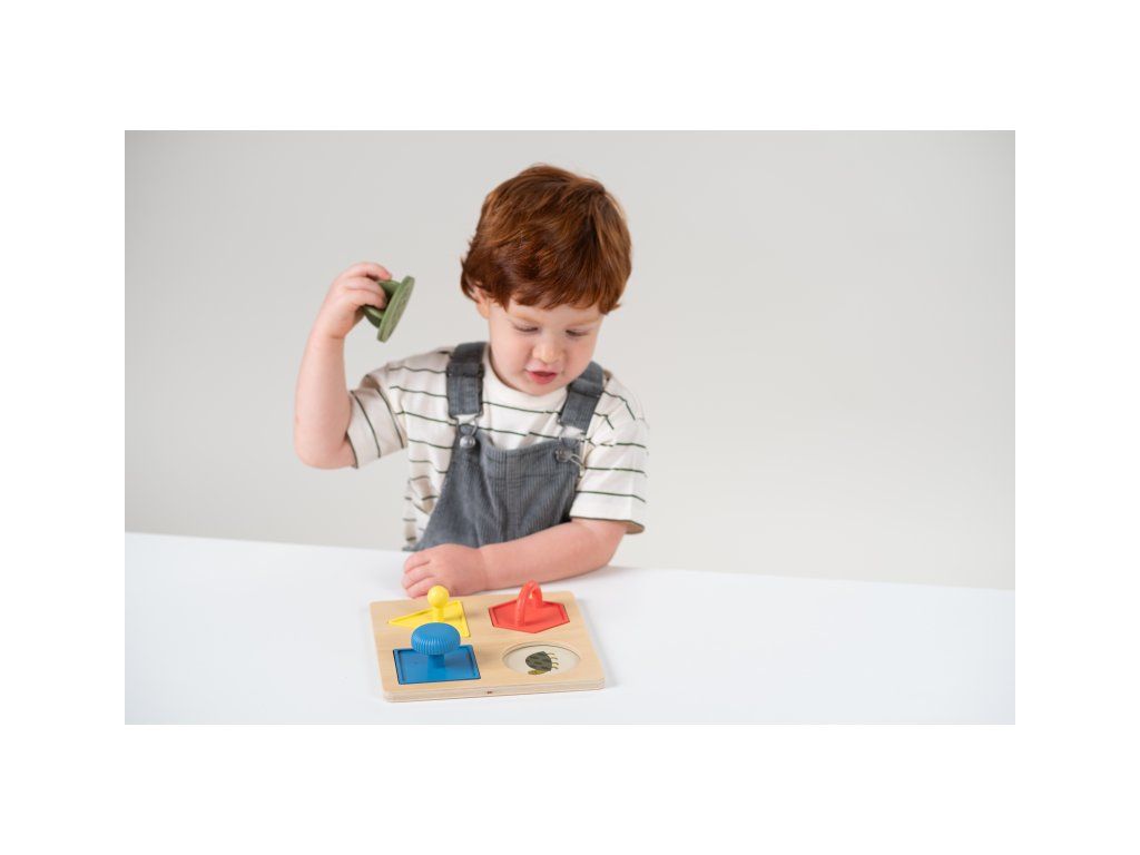 Vkladacie puzzle rôznych tvarov s úchytmi a výmenným pozadím v otvoroch pomáhajú učiť dieťa farby, zvieratká, ovocie i počítanie a rozvíja jeho jemnú motoriku. Úchyty jednotlivých dielikov majú rôzny tvar, takže vyžadujú rôzne spôsoby úchopu. Vkladacie puzzle dieliky môžete využiť aj ako pečiatky.