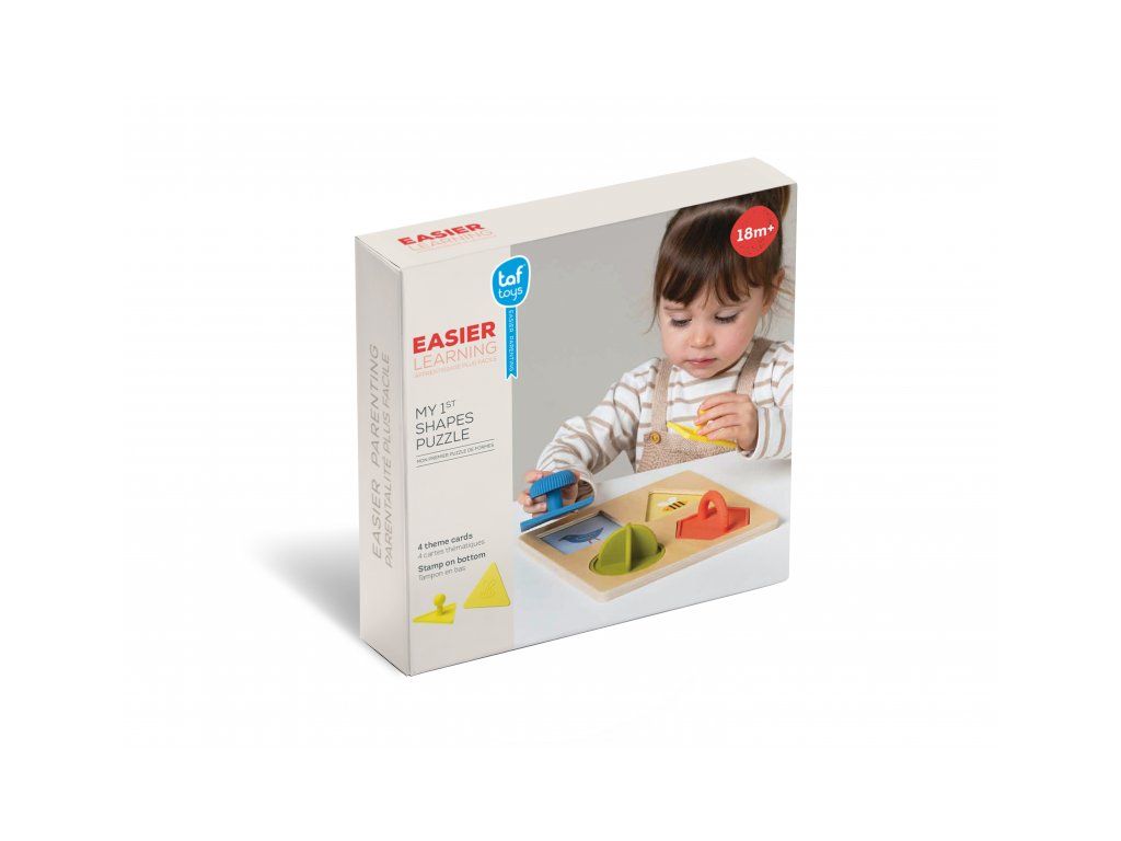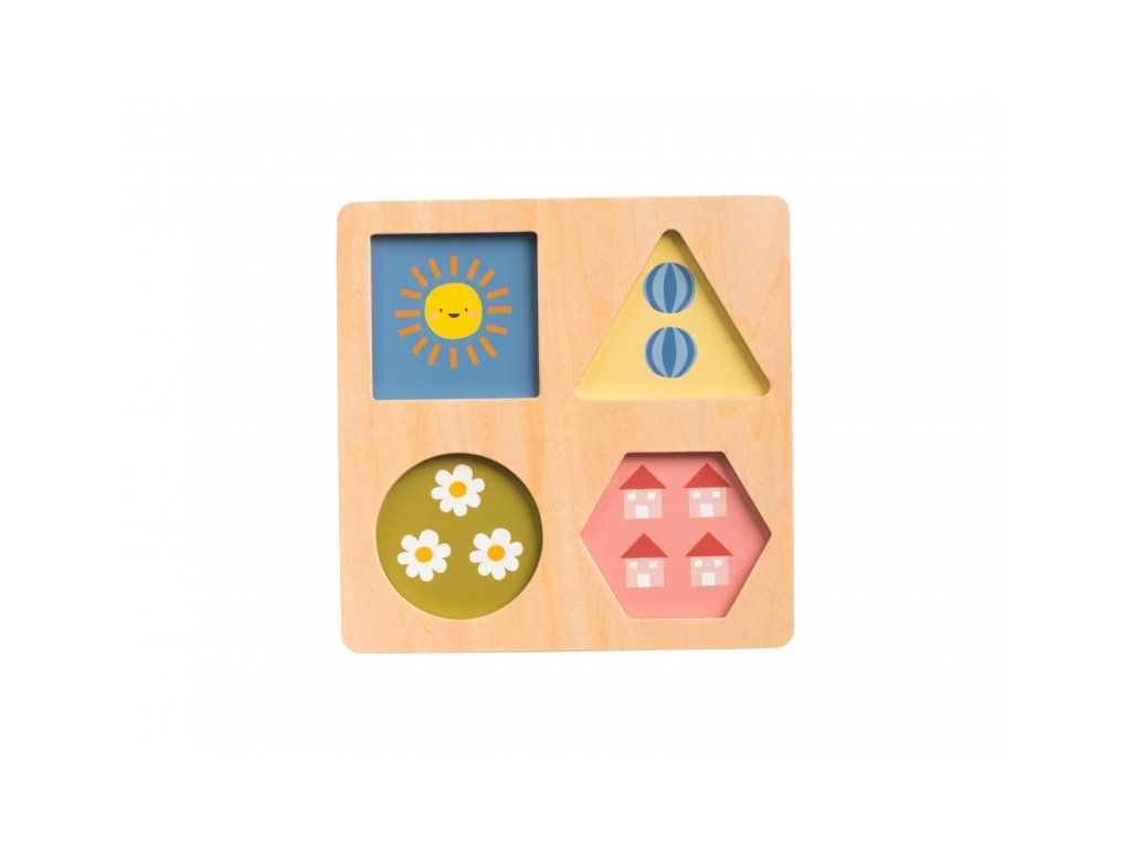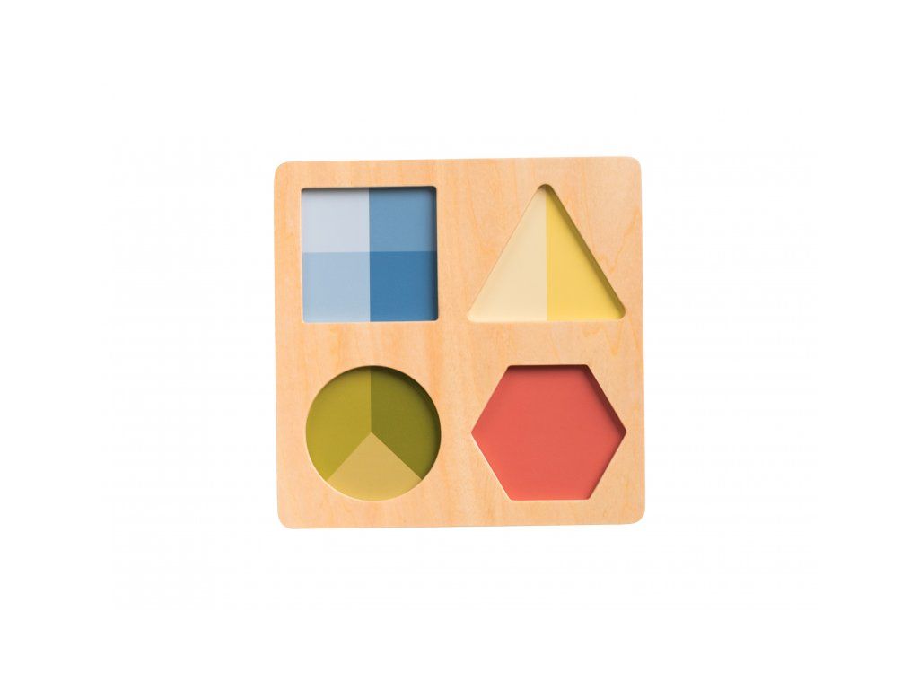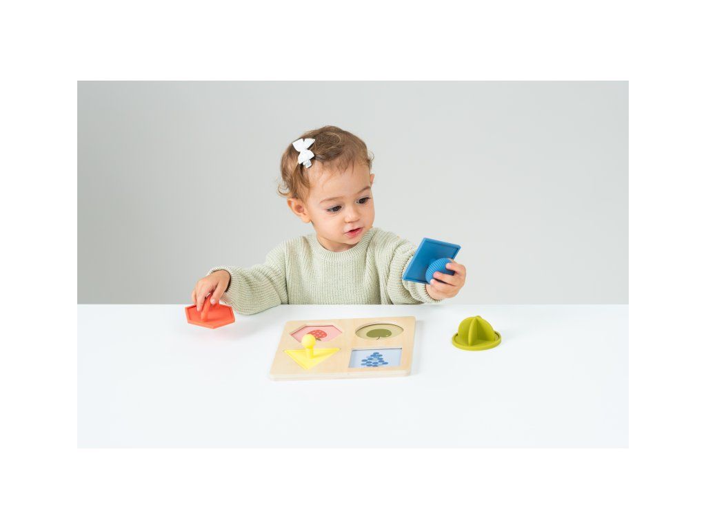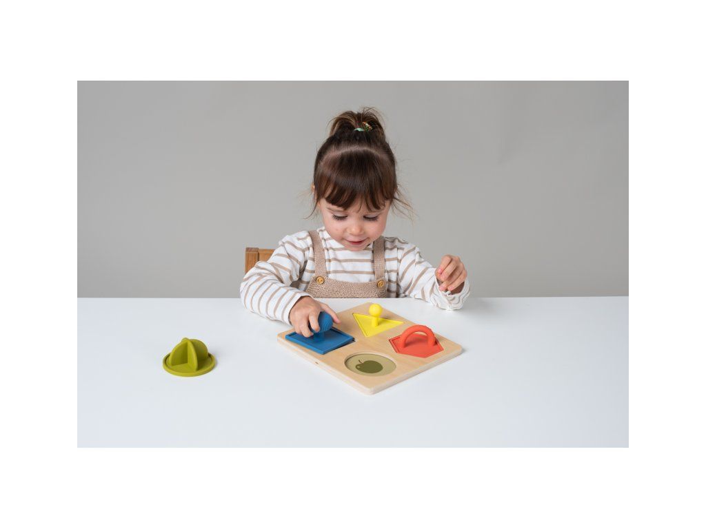 Vkladacie puzzle rôznych tvarov s úchytmi a výmenným pozadím v otvoroch pomáhajú učiť dieťa farby, zvieratká, ovocie i počítanie a rozvíja jeho jemnú motoriku. Úchyty jednotlivých dielikov majú rôzny tvar, takže vyžadujú rôzne spôsoby úchopu. Vkladacie puzzle dieliky môžete využiť aj ako pečiatky.