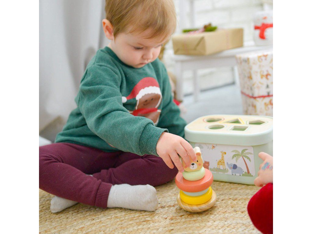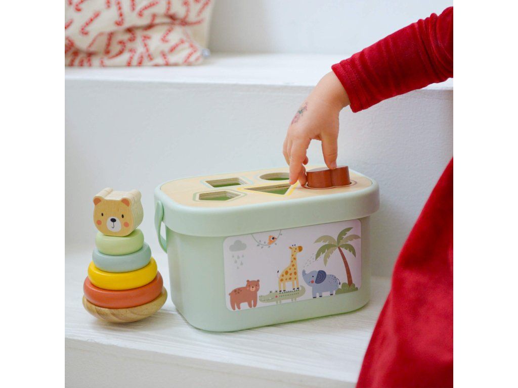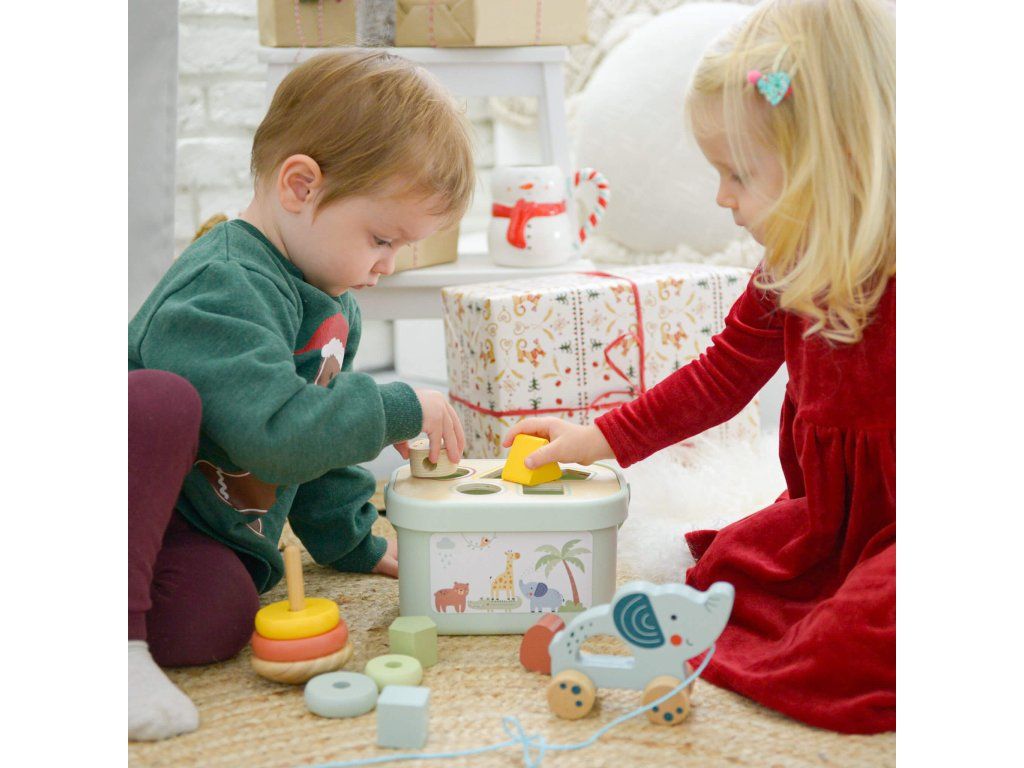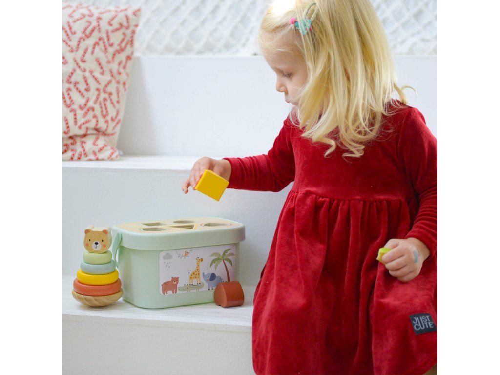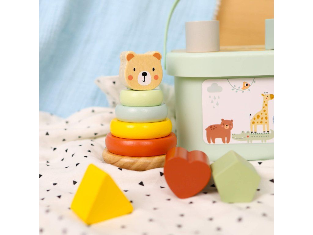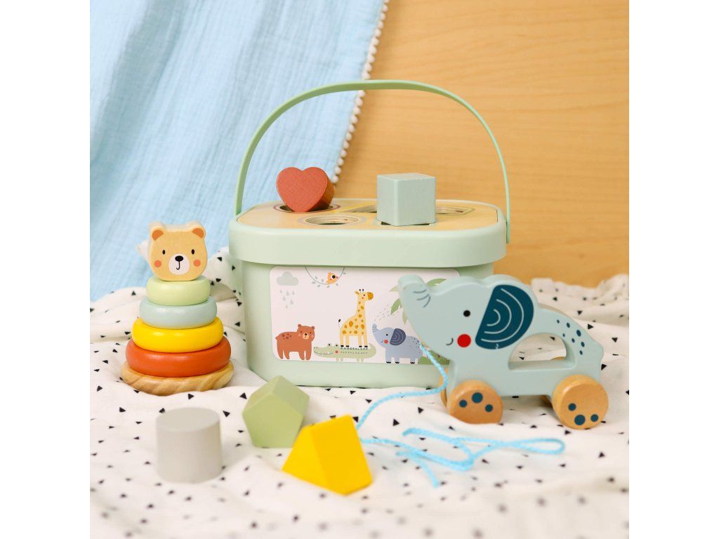 Sada hračiek 3 v 1 Pastel 3 hračky od 1 roka v jednom boxe Súprava drevených hračiek vo vedierku v pastelových farbách od Tooky Toy zabaví všetky deti približne od jedného roka. Obsahuje 3 zábavné a vzdelávacie hračky, ktoré podporujú zdravý psychomotorický rozvoj vášho dieťaťa, rozvíja aj jeho zmyslové vnímanie, logické myslenie, koordináciu ruka-oko, jemnú motoriku a ďalšie. A vás poteší, že po hre zase všetko upratá do vedierka. Ten si môžete so sebou zobrať aj na cesty!Box pre deti od 1 roku 3 v 1 obsahuje: drevená pyramída Nasadzovacie krúžky Macko 6 ks,drevená ťahacia hračka Slon,drevená Vkladačka tvary 5 ks + veko boxu v podobe vkladačky.Sada hračiek podporuje rozvoj detí Vďaka tomuto boxu 3 v 1 nebudete kupovať zbytočne veľa nevhodných či plastových hračiek. Drevené vzdelávacie hračky Tooky Toy sú vyrábané s ohľadom na životné prostredie z dreva z udržateľného lesníctva a ďalších bezpečných materiálov. Farby sú netoxické a úplne bezpečné. Súprava hračiek 3 v 1 je vhodná ako darček k 1 roku.Dodatočné parametre