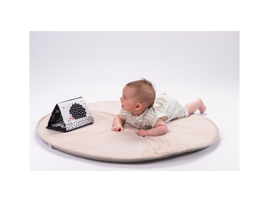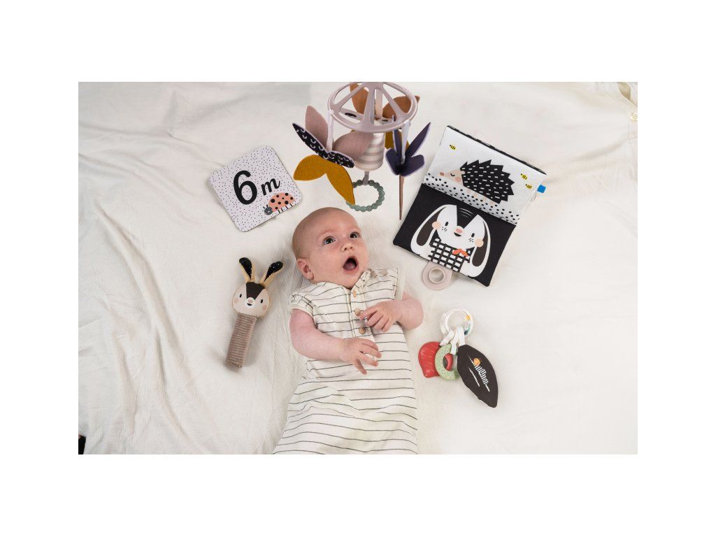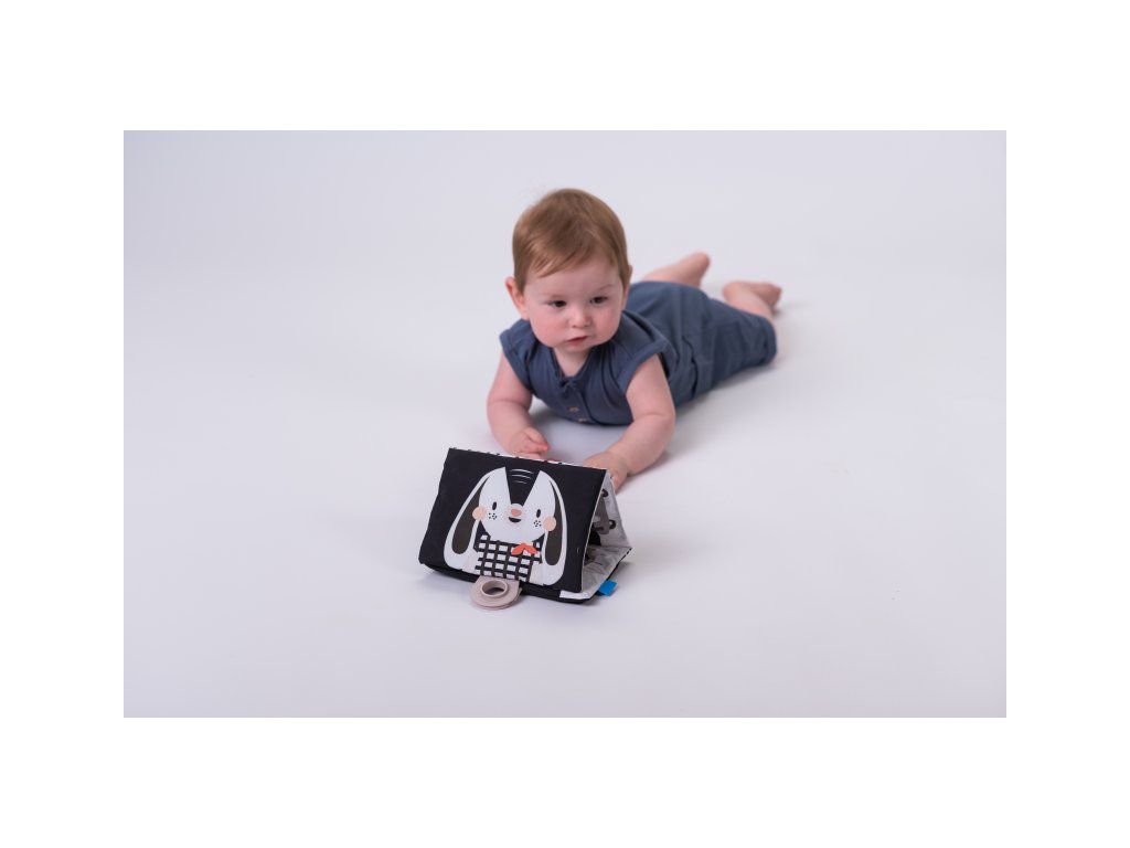 - Knižka na bruško: Černobiela šuštivá knižka pre stimuláciu zmyslov je ideálna pre čas hry na brušku, podporuje zrakový a sluchový vývoj.