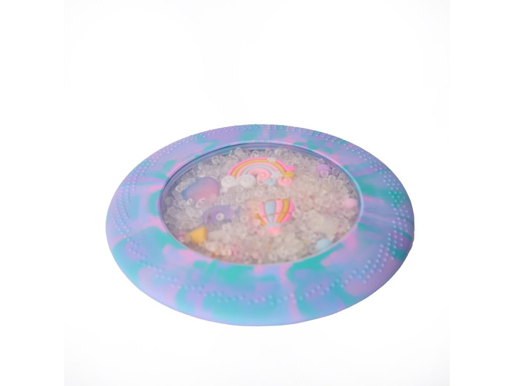 Mäkký silikónový disk s priehľadným okienkom ukrýva drobné nezávadné figúrky a guľôčky, ktoré môžu deti stláčať, tlačiť, posúvať, hľadať, naťahovať aj pátrať po skrytých pokladoch. Obľúbená hra „hľadaj a nájdi!“ tak dostáva nový rozmer a nikdy sa neomrzí. Hračka je ideálna pre malé ručičky, ktoré milujú stláčanie, objavovanie a skúmanie dotykom.