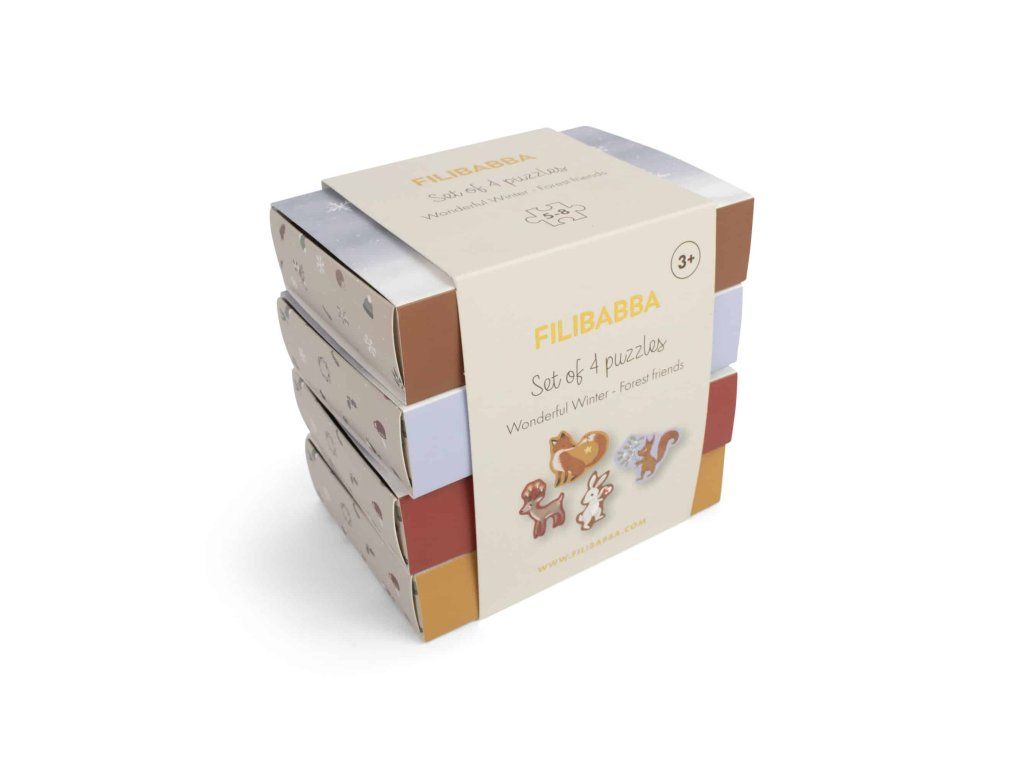 Nie je nič krajšie ako radosť z dokončenia puzzle! Táto rozkošná súprava predstavuje obľúbených lesných kamarátov značky FILIBABBA – zajaca, veveričku, líšku a jeleňa – oživených v štyroch zimne ladených puzzle. Každé puzzle má 5, 6, 7 a 8 veľkých dielikov, ideálnych pre malé ručičky, a pomáha rozvíjať jemnú motoriku.