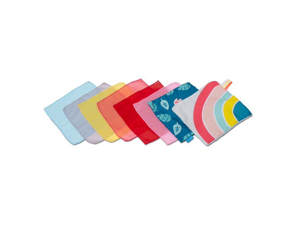Box obsahuje 10 šatiek: 8 šatiek rôznych farieb z jemnej organzy a 2 šuštiace šatky s rôznorodou textúrou a potlačou. Dieťa môže šatky z boxu vyťahovať a znovu ich do neho vkladať, skúmať ich textúry, v staršom veku potom spoznávať ich farby, počítať ich a pod.