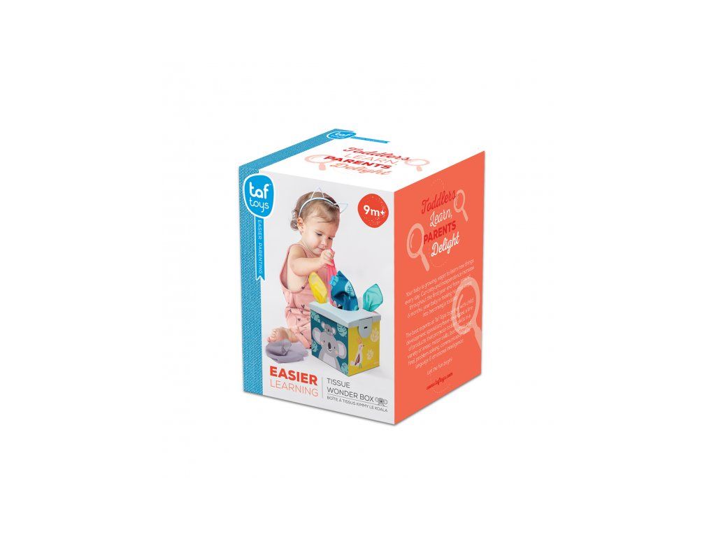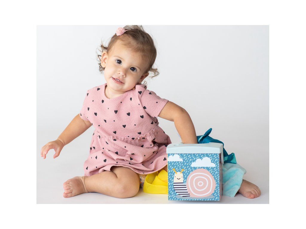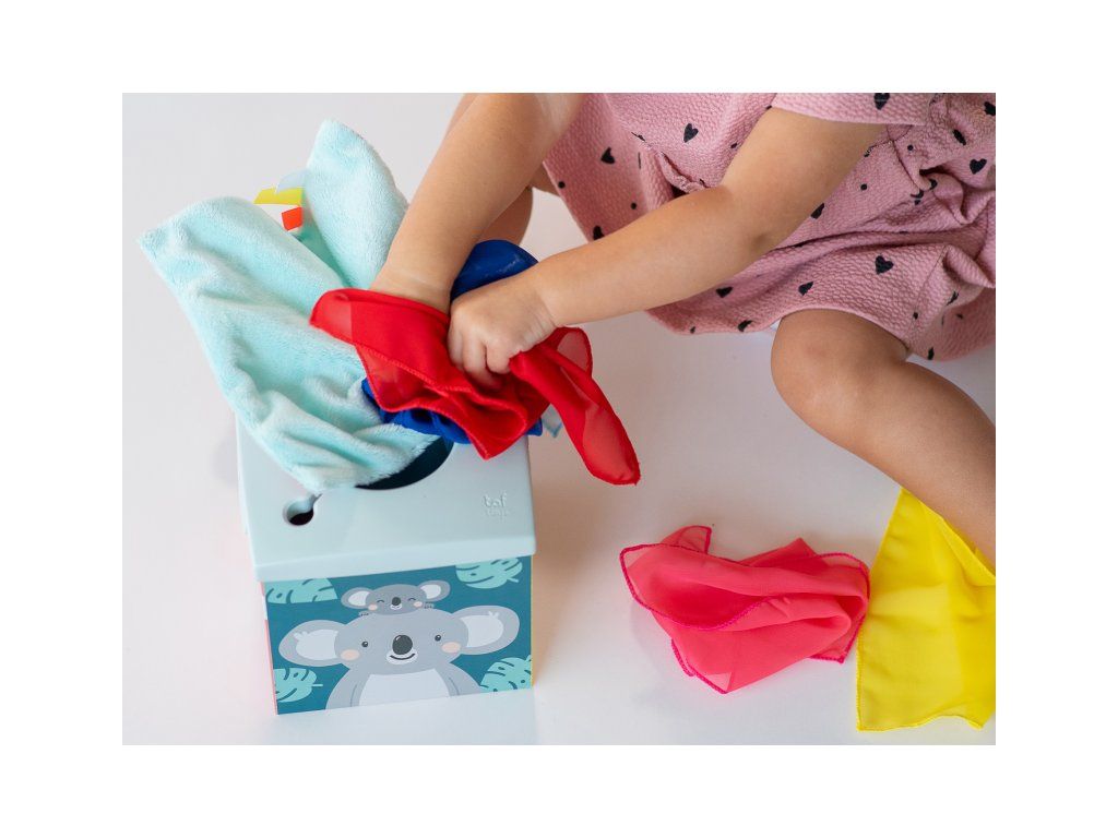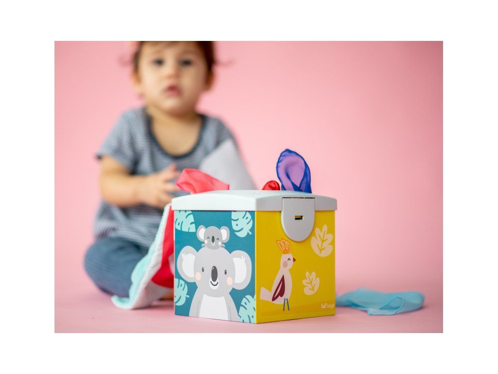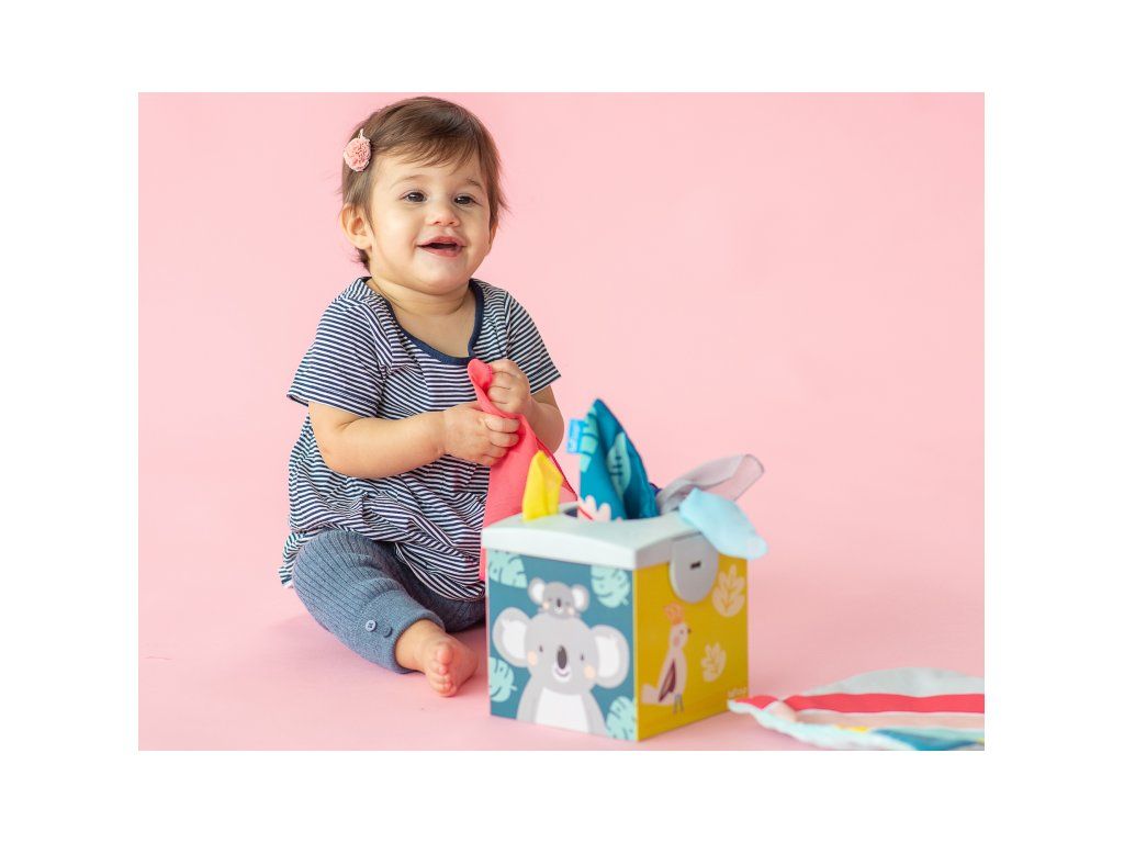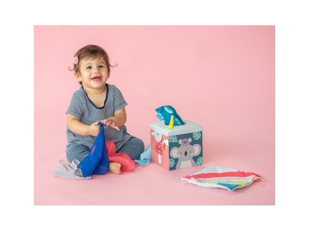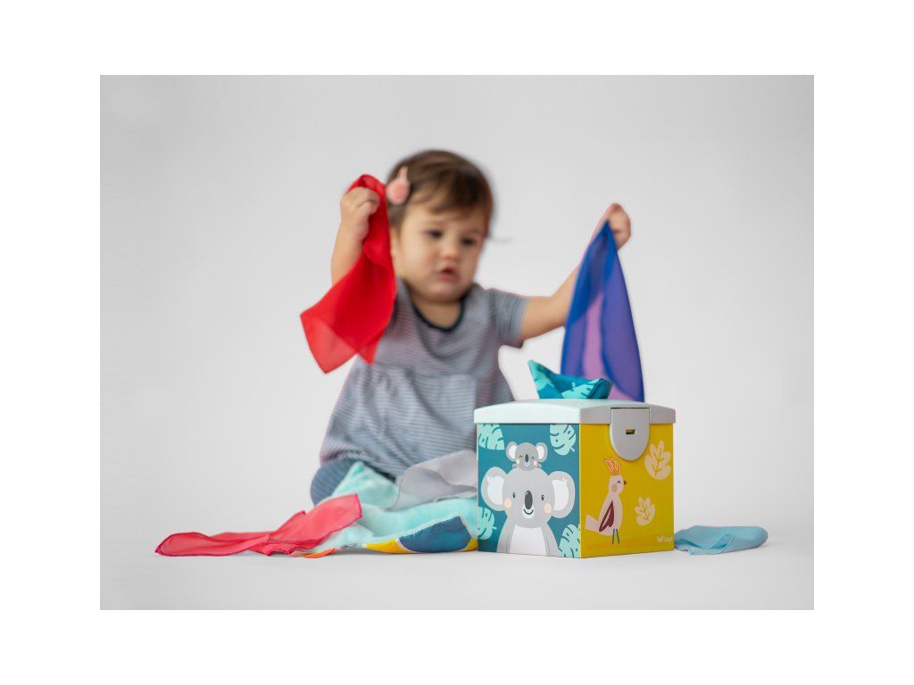 Originálny box s otvorom naplnený textilnými šatkami zaistí vášmu dieťaťu zábavu na dlhé hodiny a zároveň podporí rozvoj jeho zmyslov i jemnej motoriky.