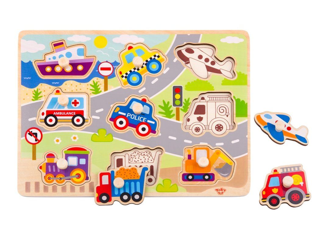 Vkladacie puzzle Dopravné prostriedkyPrvé skladačky pre malého vodičaTáto krásna drevená vkladacia hračka od značky Tooky Toy prináša deťom podkladovú dosku a 9 drevených dopravných prostriedkov (napr. policajné auto, lietadlo, bager) – ideálne na učenie farieb, tvarov a základov dopravy už od približne 18 mesiacov. Vozidlá, tvary a farby v jednej hravej úloheVkladacie dieliky majú úchytky – deti ich ľahko uchopia a správne zaradia na dosku, čím rozvíjajú jemnú motoriku a koordináciu ruka–oko. V tematike dopravy sa deti učia rozlišovať rôzne vozidlá – rozvíja sa ich slovná zásoba, pozorovanie a logika.Vyrobené z kvalitného dreva z udržateľných zdrojov a natreté netoxickými farbami – bezpečné pre najmenších. Veľké dieliky vhodné pre menšie ruky – skvelé ako prvá skladačka v detskej izbe.Dodatočné parametre
