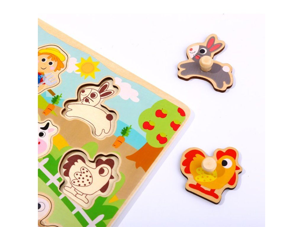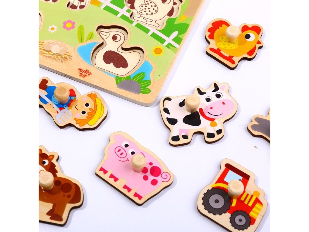 Vkladacie puzzle FarmaNa návšteve u zvieratiek a objavovanie farmyTáto drevená vkladacia hračka od značky Tooky Toy prenesie dieťa priamo na farmu – obsahuje podkladovú dosku a 9 dielikov (kravička, kôň, prasiatko, ovečka, kačička, kohút, zajac, farmár a traktor) v jemných pastelových farbách. Deti tak spoznávajú zvieratká, tvary aj farby hravou formou. Učenie, ktoré deti bavíVkladanie dielikov do správnych výrezov rozvíja jemnú motoriku, koordináciu ruka-oko a schopnosť sústredenia. Motív farmy pomáha rozšíriť slovnú zásobu a podporuje učenie o zvieratkách a prostredí.Veľké dieliky s úchytkami sú prispôsobené malým rukám, ideálne pre deti od približne 18 mesiacov. Vyrobené z kvalitného dreva z udržateľného lesníctva, s netoxickými farbami – bezpečné pre hranie v detskej izbe.Dodatočné parametre