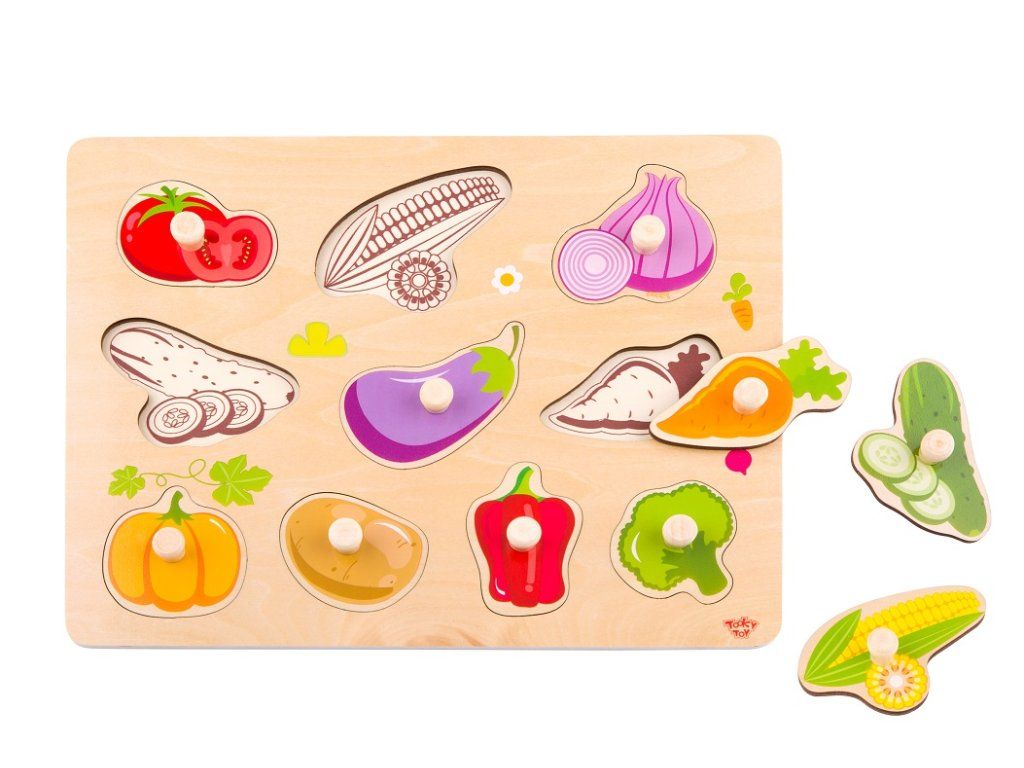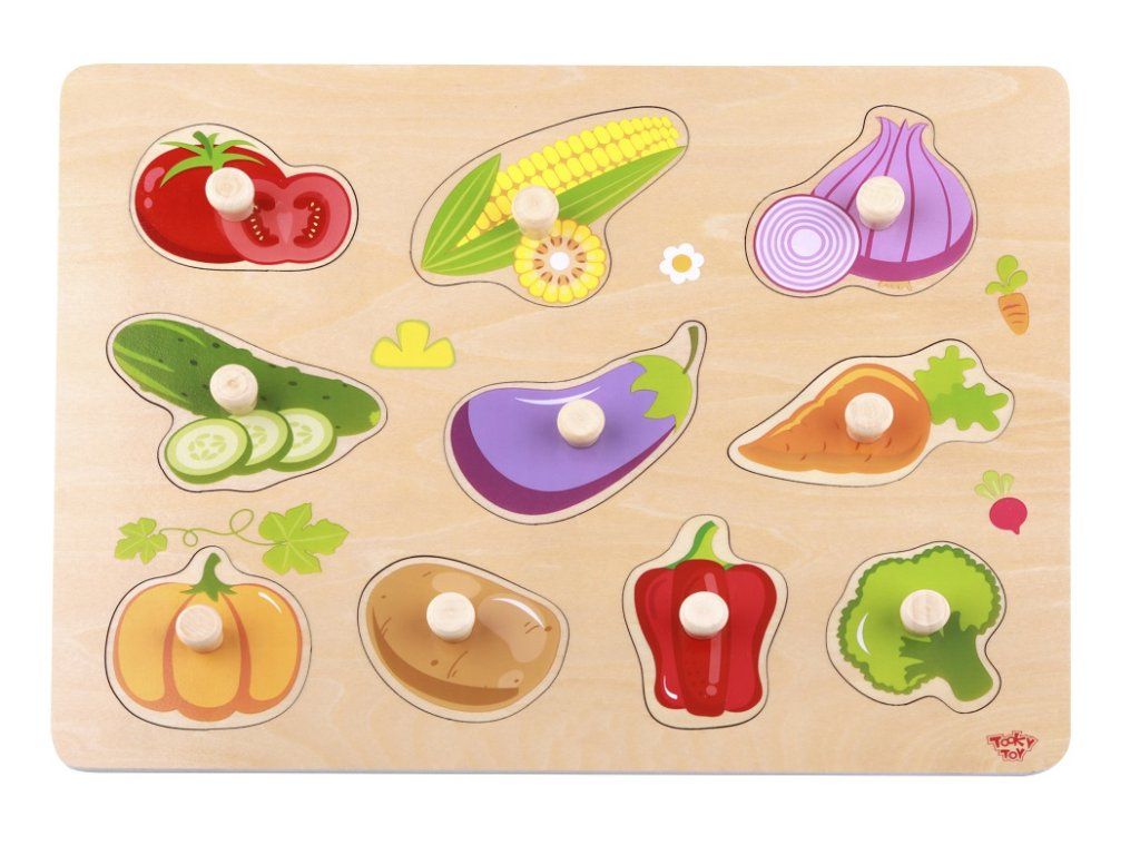 Vkladacie puzzle ZeleninaZeleninová skladačka plná farieb a prvých objavovObjavte svet zeleniny s touto krásnou drevenou vkladacou hračkou od Tooky Toy — podkladová doska + 10 veselých kusov zeleniny (napr. mrkva, paradajka, brokolica) v jemných pastelových farbách. Hra podporuje učenie, manipuláciu a radosť z objavovania. Hravé učenie plné fariebDieliky s úchytkami sú navrhnuté pre malé ruky – uľahčujú uchopenie a zvyšujú sebavedomie pri hraní. 10 druhov zeleniny pomáha deťom spoznať farby, tvary a meniace sa výrazy – učia sa hravou formou. Vyrobené z udržateľného dreva, ručne natreté farbami na vodnej báze, bez formaldehydu – bezpečné pre najmenších. Vhodné pre deti už od približne 18 mesiacov – ideálny krok do sveta hier a rozvoja.Dodatočné parametre