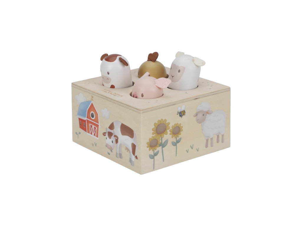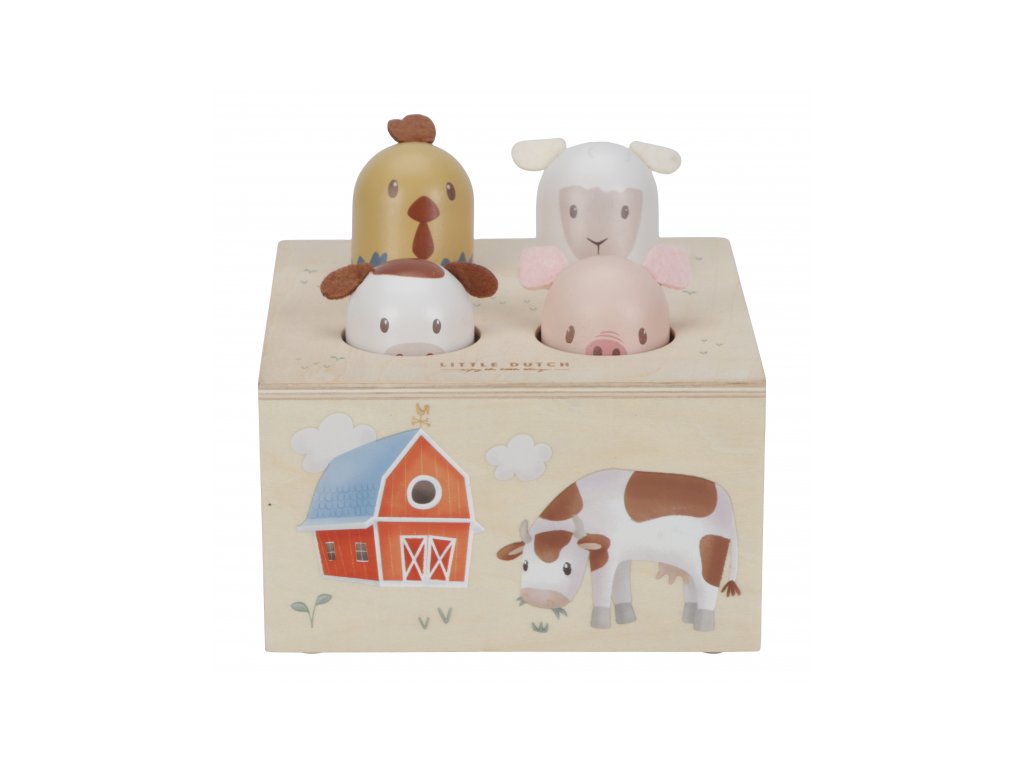 Zábavná a originálna hračka so zvieratkami z farmy bude baviť deti aj vás! Zatlačením na hlavičku zvieratka jedno zasuniete a druhé vyskočí, zároveň budete počuť zvuky, ktoré prasiatko, ovečka, kravička a sliepočka vydávajú.