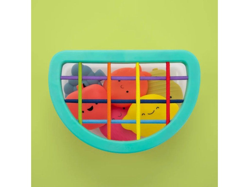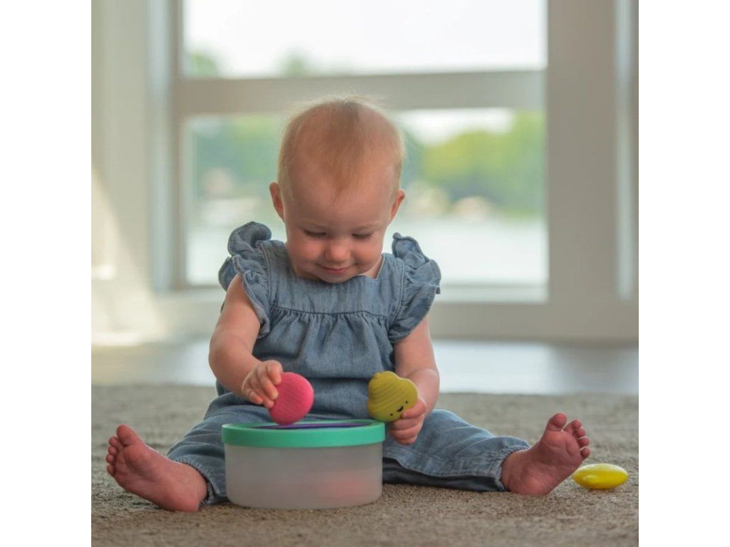 - 9+ mesiacov: Nasaďte veko na nádobu. Dieťa môže umiestňovať tvary cez elastické pásiky. Táto činnosť pomáha rozvíjať jemnú motoriku a koordináciu ruka-oko. Rovnako ako pri plnení a vysypávaní bude dieťa túto činnosť opakovať a budovať nové mozgové spojenia.