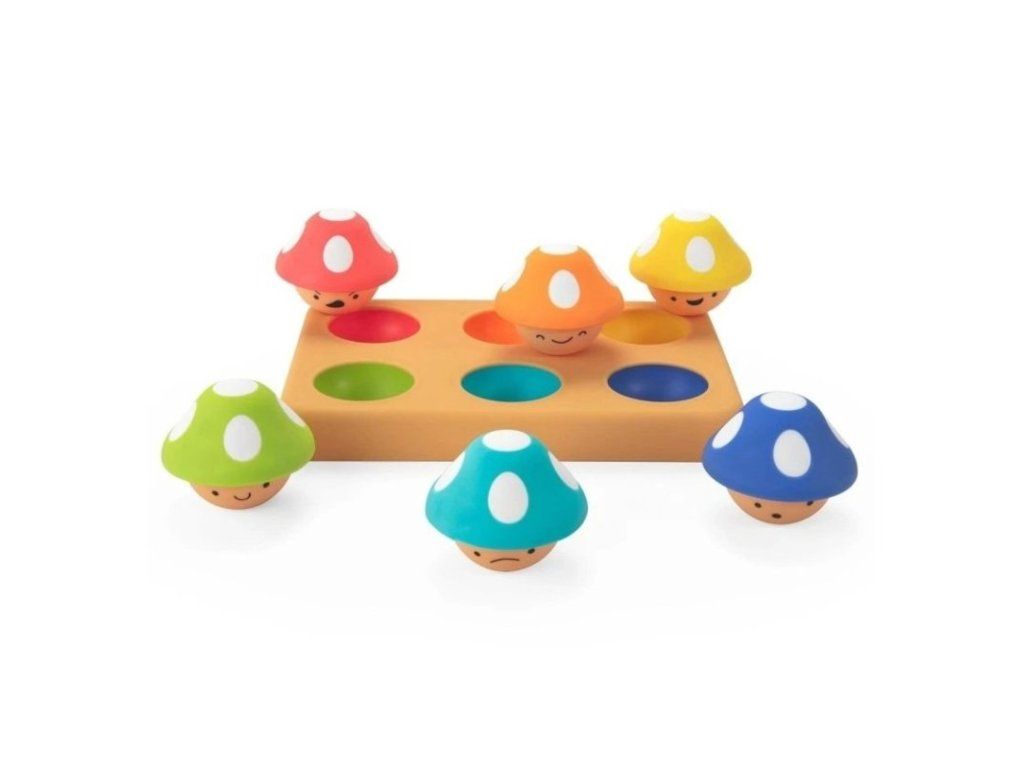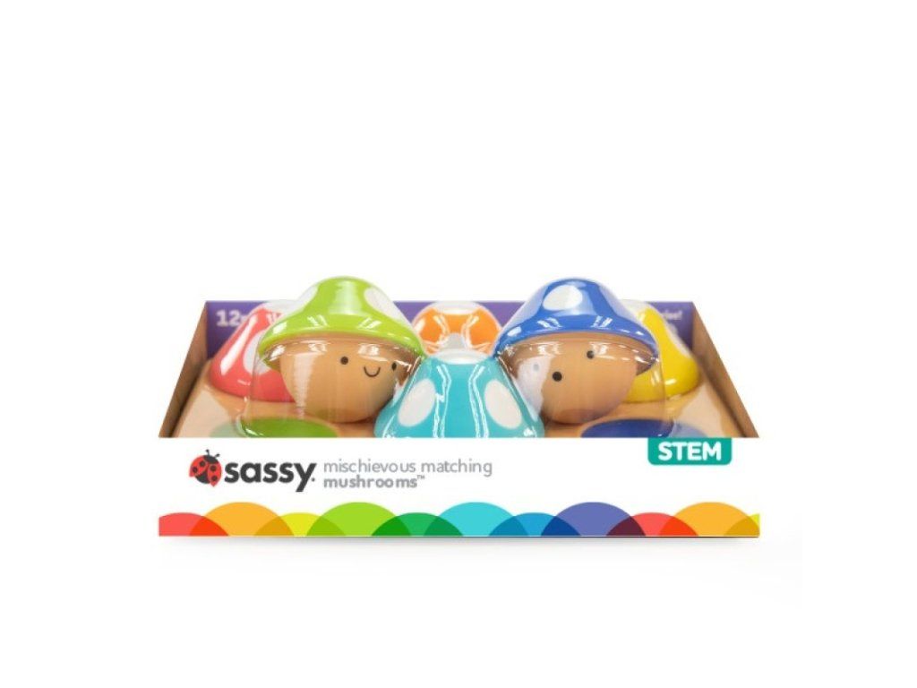v 12+ mesiacoch môžu dospelí pomôcť dieťaťu učiť sa farby tým, že povedia názov farby hubky a potom ukážu na zodpovedajúcu farbu na podložke, aby dieťa hubku umiestnilo. Veľké HURÁ za škárovanie všetkých 6 hubiek!