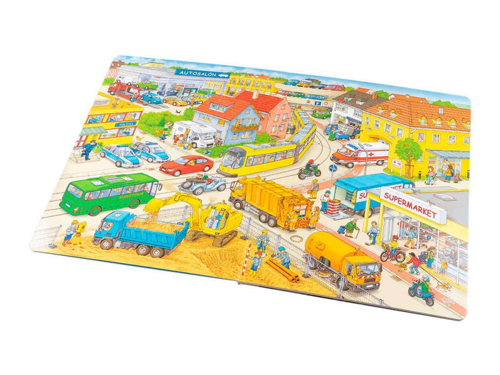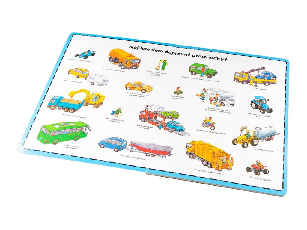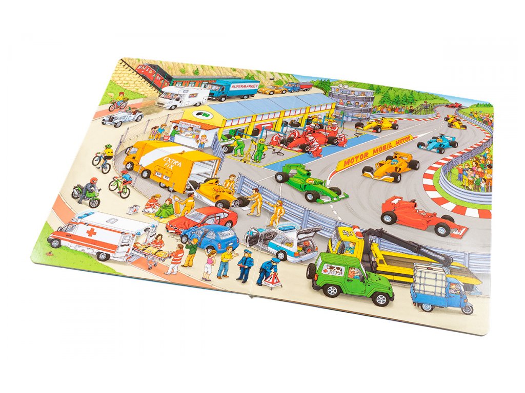kniha tiež celý rad námetov na vlastné príbehy malých milovníkov áut. Táto veľkoformátová kniha prináša panoramatické obrazové náhľady do prostredia ciest, stavieb, ale aj do iných oblastí.