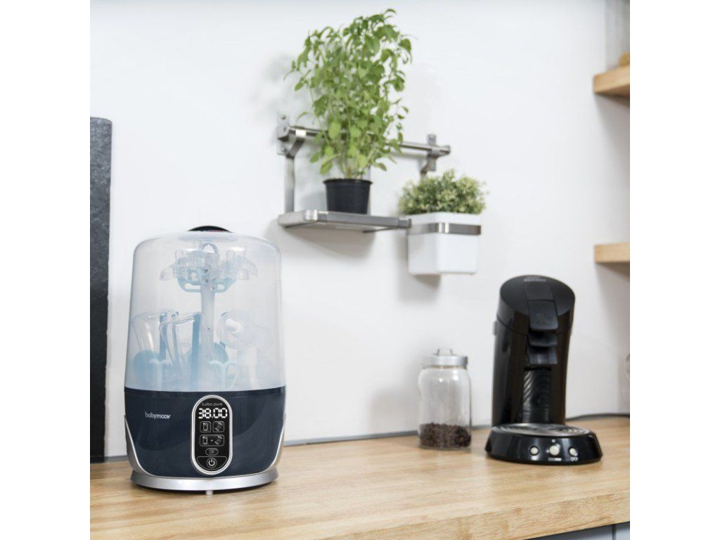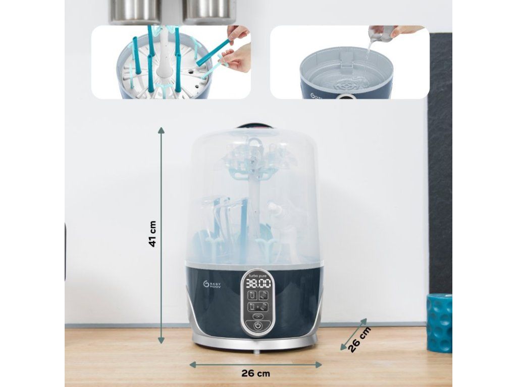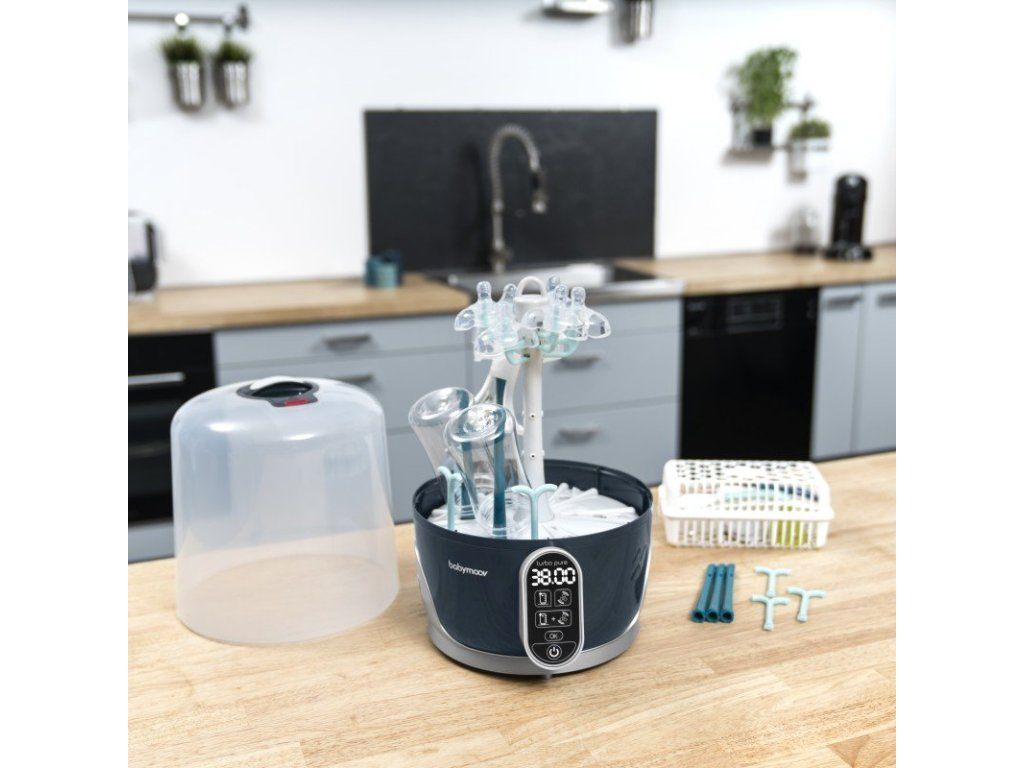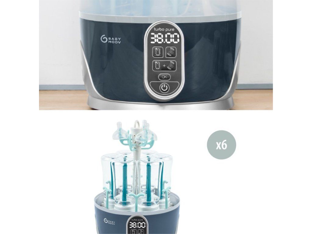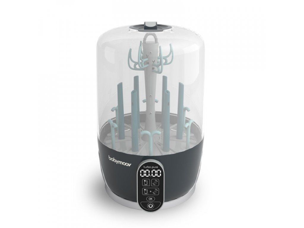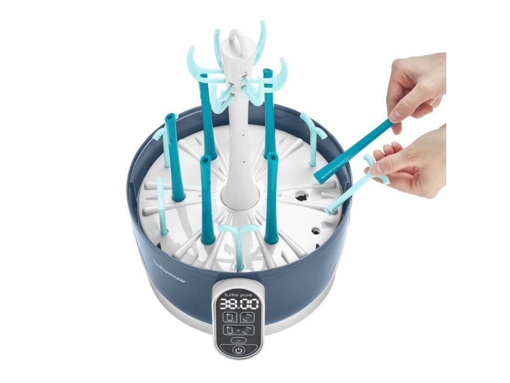 95°C prírodné pary vyrábanej prístrojom Turbo Pure eliminuje i tie najviac odolné baktérie (99%), pachy a nánosy vápnika z mlieka. Parné ramená (tmavo zelená) sú odnímateľná, čo umožňuje jednoduché rozmiestnenie fliaš a príslušenstva. Môžete naraz sušiť až 6 detských fliaš, cumlíky, odsávačky a ďalšie príslušenstvo kompatibilné so sterilizáciou. Vďaka cyklu all-in-one (sterilizácia + sušenie), sú všetky vaše potreby vyčistené a vysušené bez potreby manipulácie či prenosu, čo predstavuje malé alebo nulové riziko vonkajšieho znečistenia.