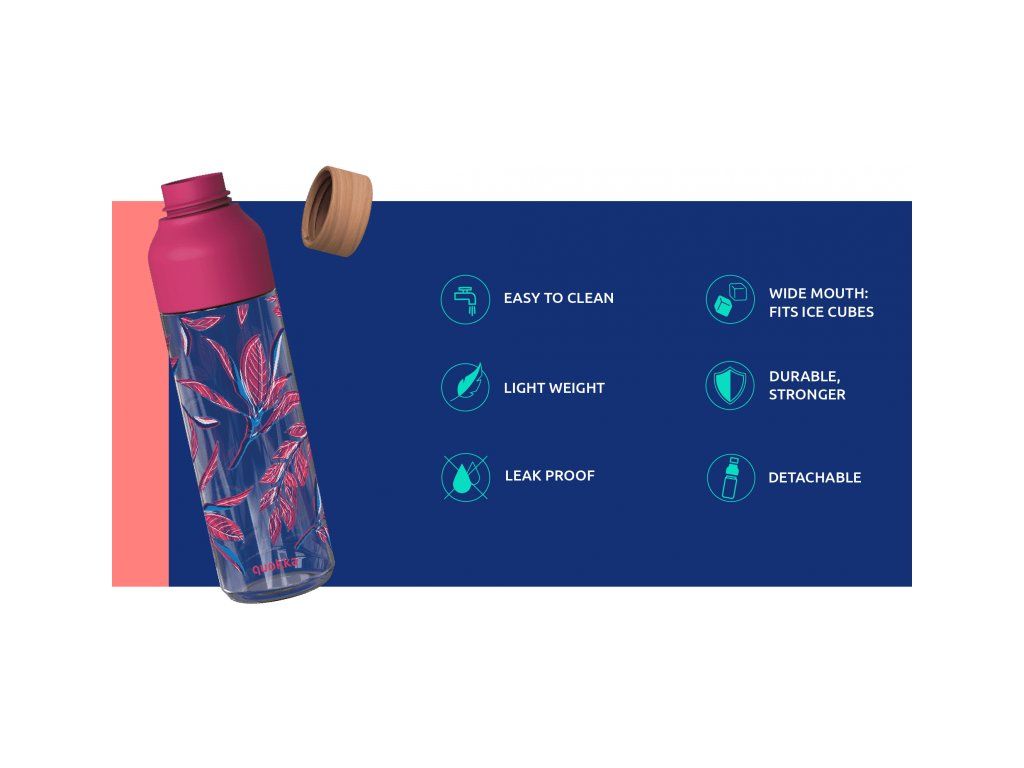 Fľaša Quokka Ice s dvojitým otváraním umožňuje vloženie kociek ľadu či kúskov ovocia a zároveň sa ľahko čistí. 100% tesniace, skrutkovacie uzávery chránia obsah fľaše pred vyliatím.
