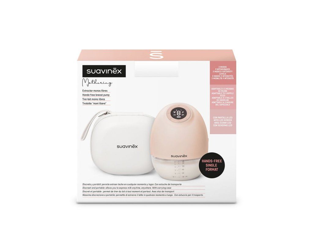 9 úrovní intenzity - umožňuje nastavenie intenzity sania: jemné pre citlivé bradavky až po silné spúšťanie bez zmeny relácií vrátane LED obrazovky - zobrazuje zvolený režim, intenzitu a tiež úroveň batérie Odsávačka je navrhnutá na použitie v spojení s akoukoľvek dojčenskou fľašou značky Suavinex. Súčasťou balenia je: - odsávačka - jediný nositeľný formát, bez hadičiek alebo káblov. Odsávajte mlieko z jedného prsníka. Zmestí sa do podprsenky. - silikónový klobúčik na uloženie prsníka - vďaka mäkkému povrchu s hladkou textúrou je pre každý prsník komfortným