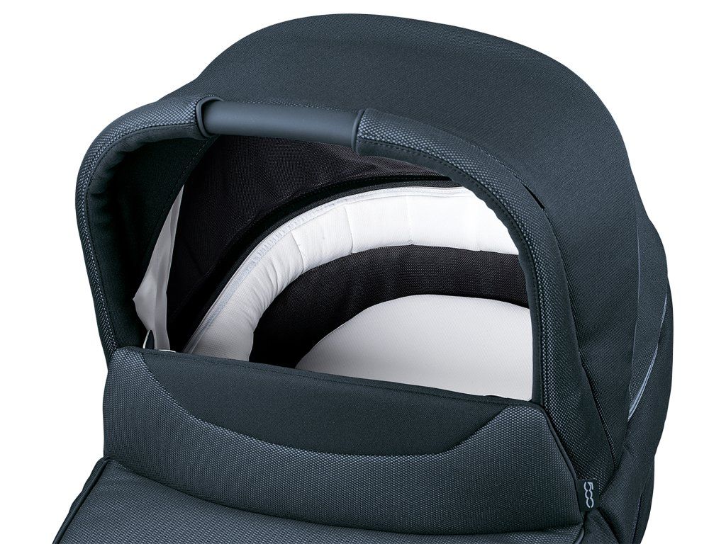 Matrace a podšívka je vyrobená z inovatívnej priedušnej tkaniny Fresco Jersey. Je rýchloschnúca, hygienická, mäkká a pohodlná. Panoramatické okno zaistí lepšiu cirkuláciu vzduchu a skvelý výhľad na vaše bábätko. Korbička má striešku so slnečným šiltom UPF 50+ a tiež praktické úložné vrecko.