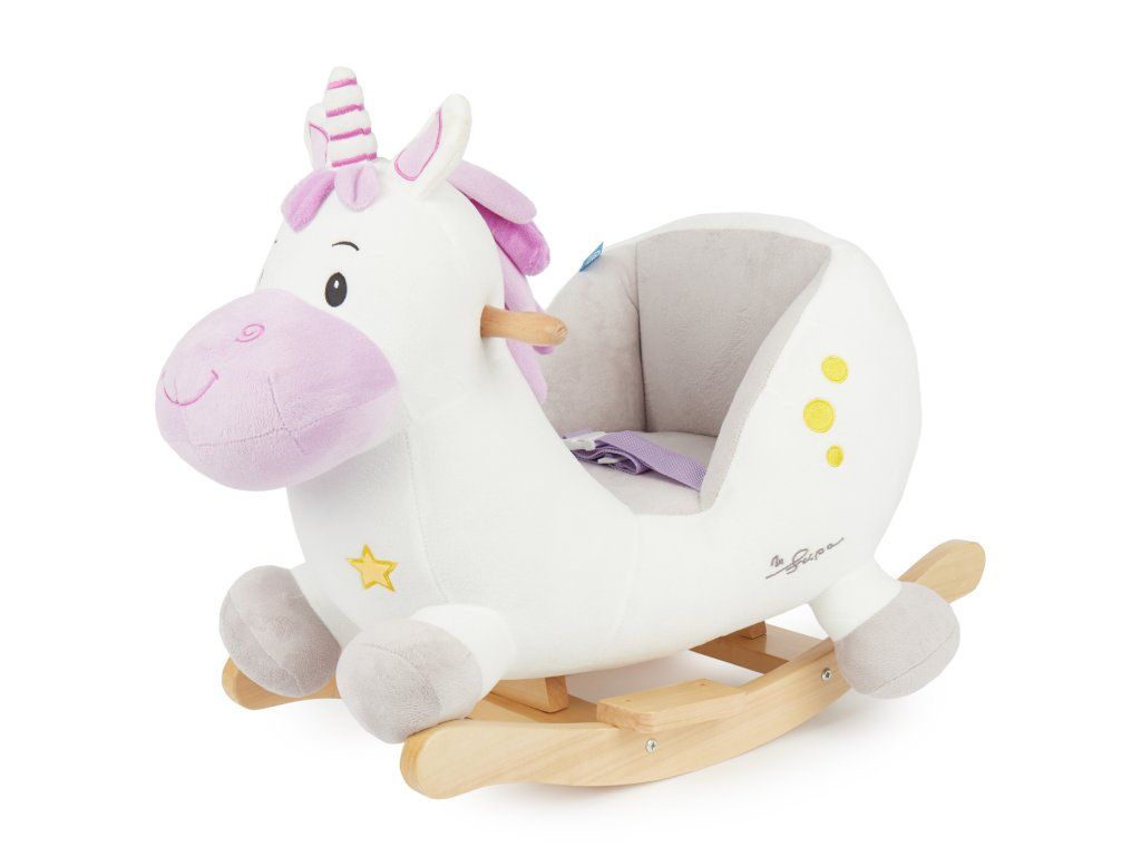 Hojdací jednorožec rozžiari oči aj tým najmenším deťom! Roztomilé hojdacie zvieratko je ako stvorené pre deti už od 9 mesiacov. Vďaka hebkému plyšovému povrchu a útulnému tvaru si deti jednorožca zamilujú a z detskej izbičky sa rýchlo stane ich obľúbené miesto. Hojdačka je vybavená mäkkým, pohodlne polstrovaným sedadlom s bezpečnostným pásom, ktoré poskytuje maximálne pohodlie a ochranu aj tým najmenším deťom. Hojdanie prirodzene podporuje motoriku, rozvíja rovnováhu a napomáha pohybovej aktivite. Stabilná konštrukcia z masívneho dreva má ochranu proti prevráteniu, deti sa môžu držať drevených držadiel a nôžky si pohodlne oprieť o opierky. Nízka výška sedadla (cca 14 cm) uľahčuje malým deťom bezpečné nasadanie aj zosadanie.