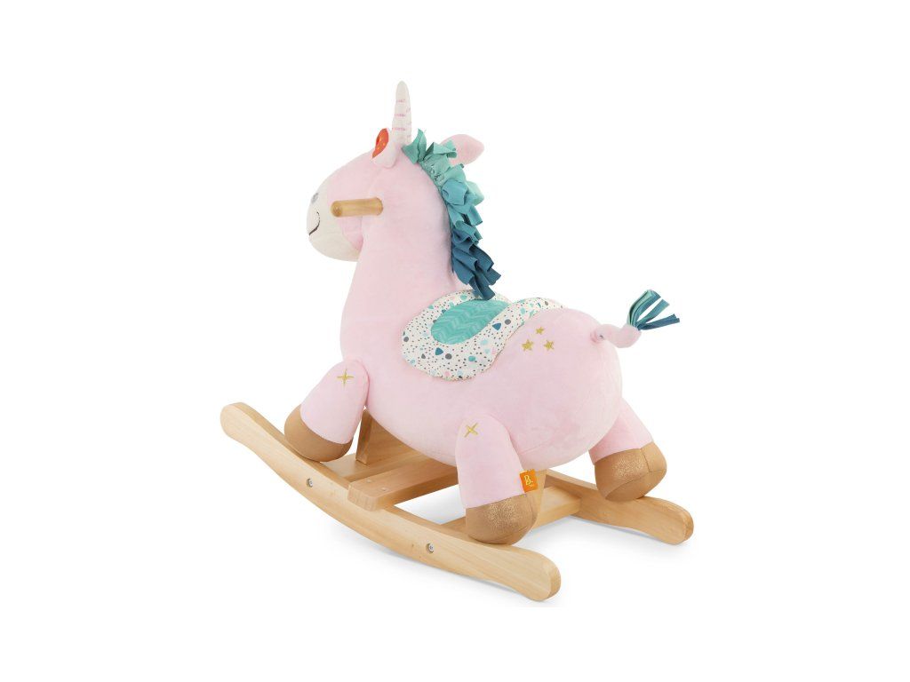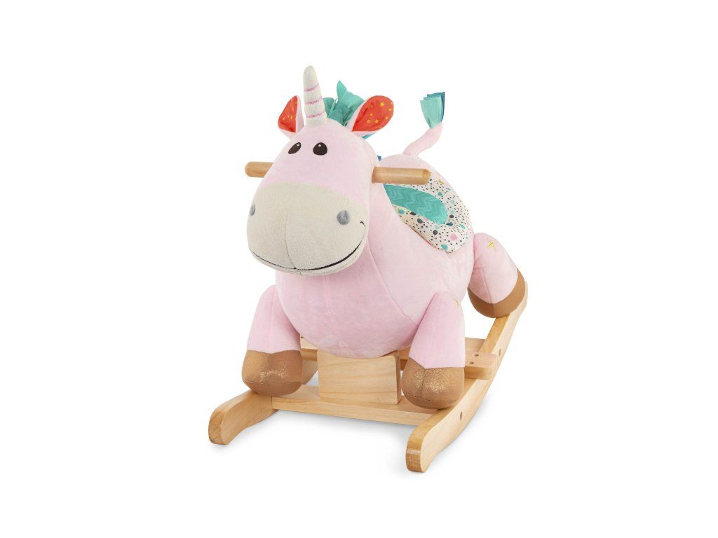 Krásny plyšový hojdací jednorožec s drevenou základňou a držadlami je hračkou, ktorá láka k hojdaniu aj k pohladeniu. Počas hojdania sa ozýva klepot kopýtok.