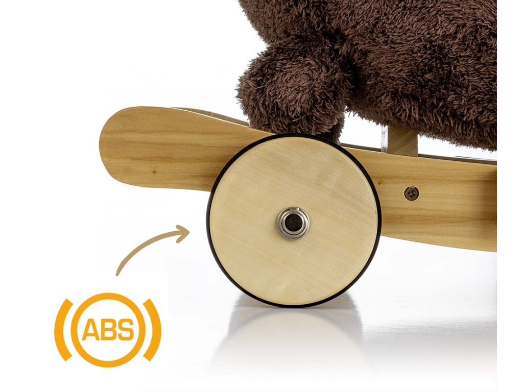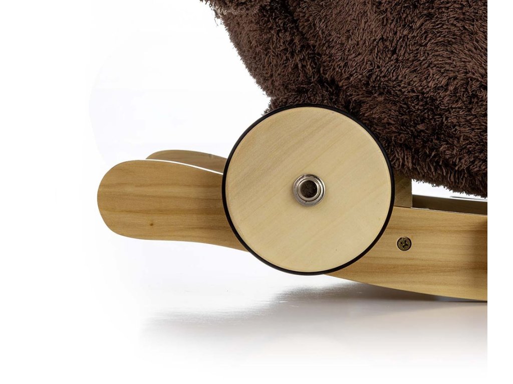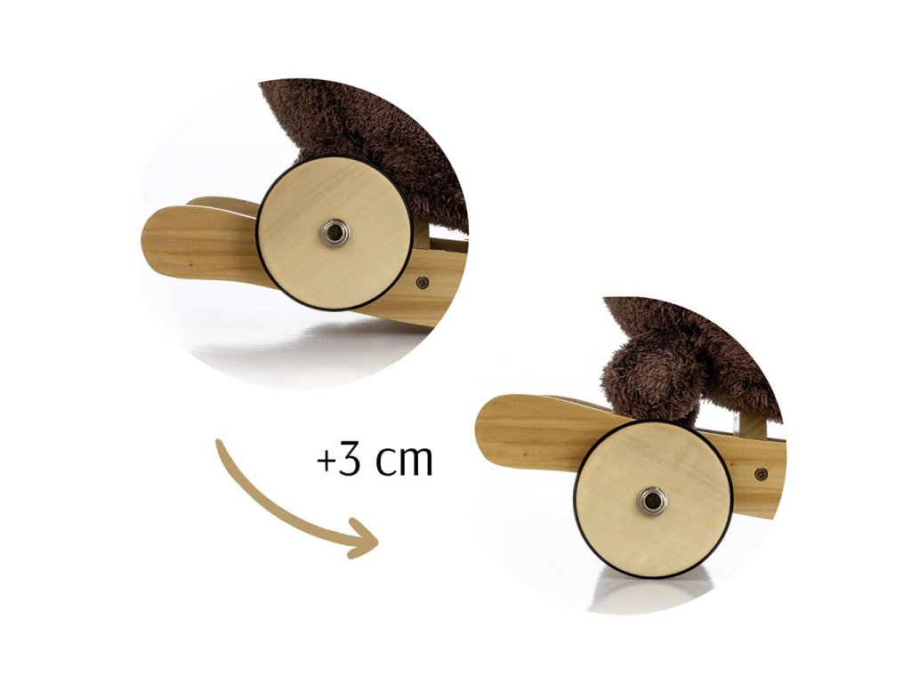 Hojdačka má drevené hojdacie lišty s opierkami na nohy a rukoväťami, ktoré pomáhajú udržiavať rovnováhu počas hry, a sadu skladacích koliesok s protišmykovým povrchom, ktoré ju v priebehu niekoľkých sekúnd premenia na nádherné plyšové vozidlo.