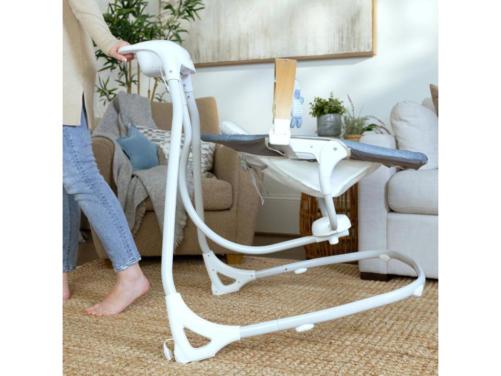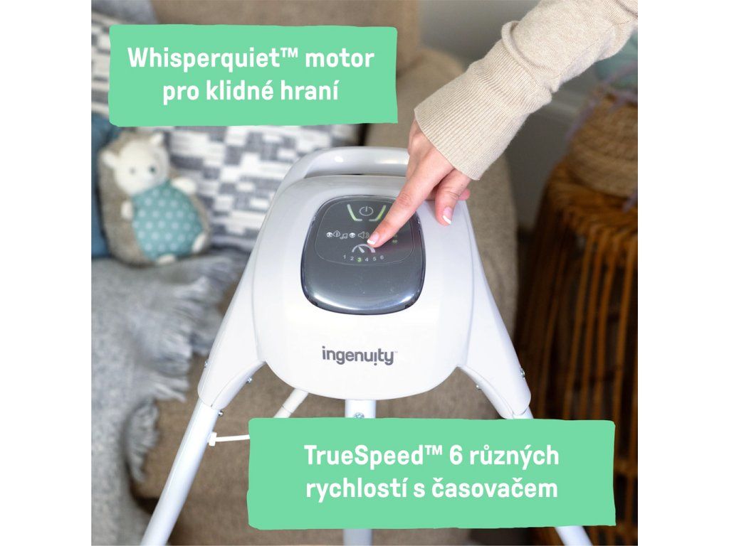 - Motor WhisperQuiet poskytuje dieťatku pokojný zážitok z hojdania. Keď dieťatko potrebuje zabaviť, naša hojdačka má 8 melódií a 3 jemné zvuky prírody. Hojdanie a hudba sú napájané USB káblom (súčasťou balenia).