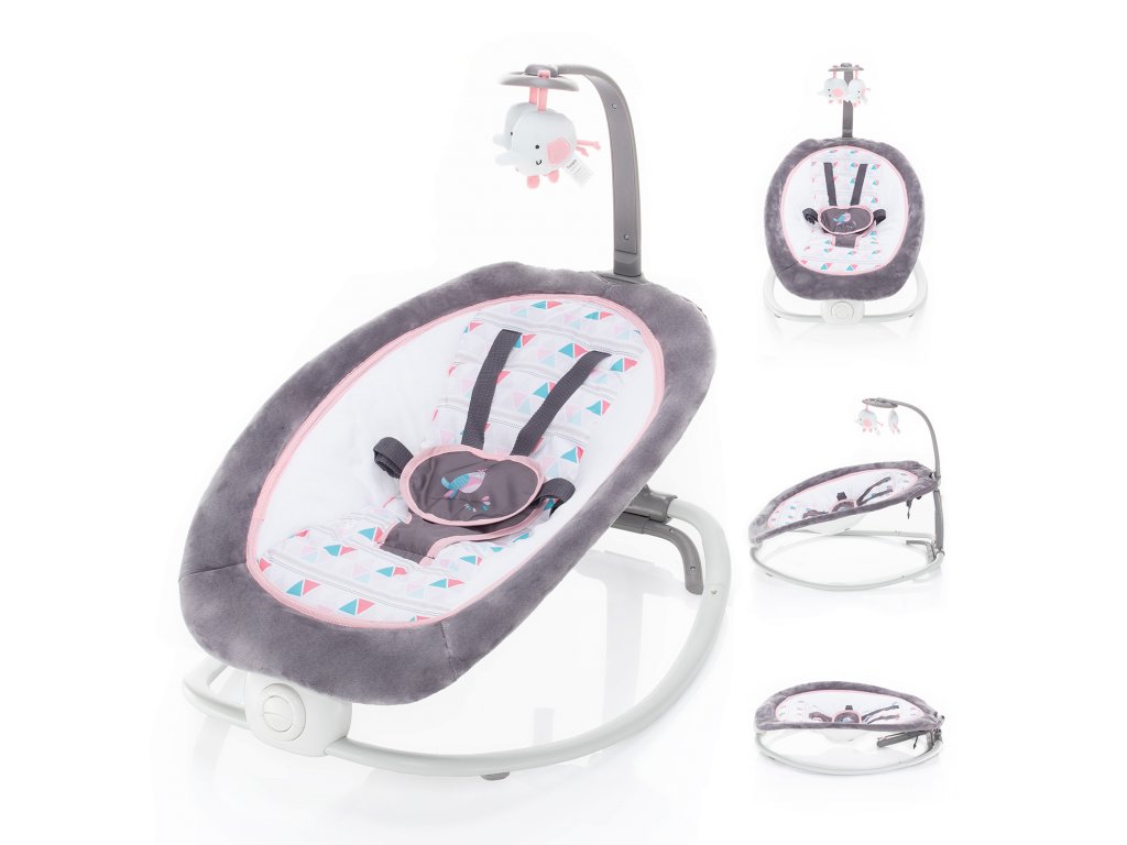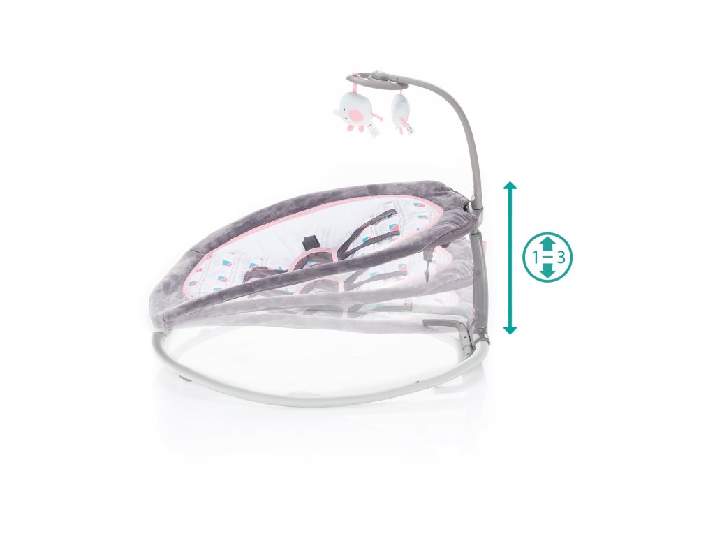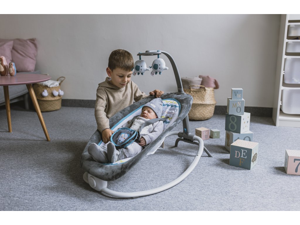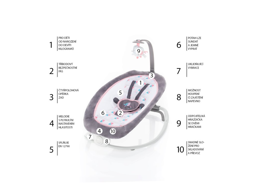 Lehátko je pre upokojenie dieťatka navyše vybavené režimom príjemných vibrácií. Pričom jej nechýba ani hrací mechanizmus s ponukou mnohých jednoduchých melódií, ktorých hlasitosť môžete plynule regulovať. O zábavu malého princa či princeznej sa ďalej postará tiež hrazda s odnímateľnými plyšovými kamarátmi.