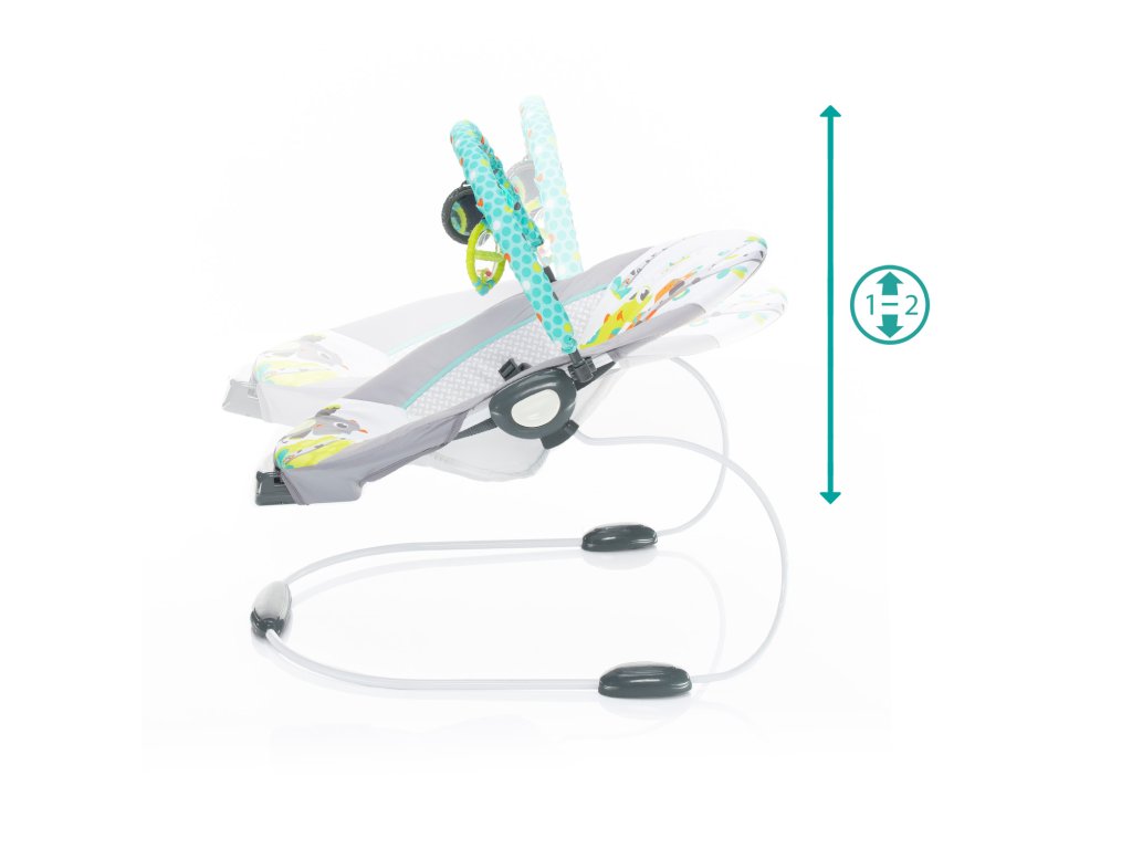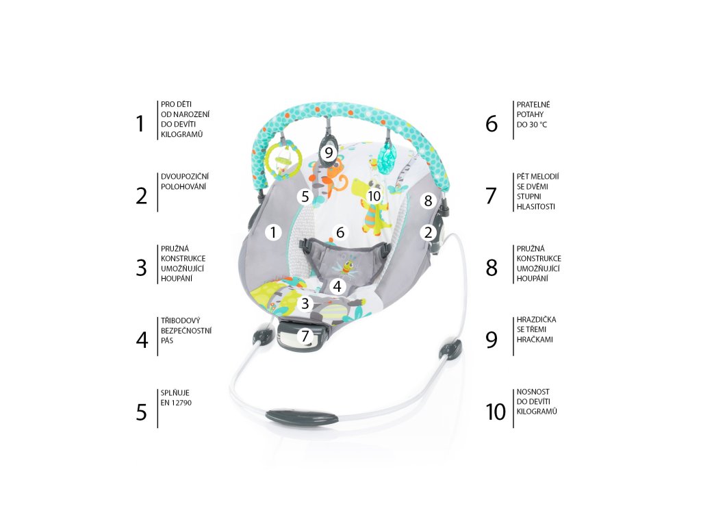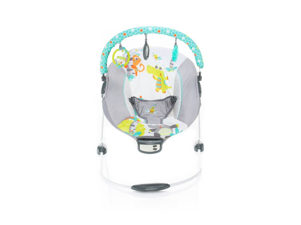 Lehátko Happy ponúkne vášmu drobčekovi veľa nových podnetov, preto si ju určite obľúbi. Jej nosným prvkom je pružná konštrukcia, ktorú si dieťatko svojimi pohybmi samo „rozhúpe“. Kým 3bodový bezpečnostný pás a protišmykové nožičky zaistí jeho bezpečnosť. Pozornosť dieťaťa v lehačce upúta tiež pekná hrazdička s 3 umývateľnými hračkami, ktoré rozvíjajú detské zmysly a jemnú motoriku. 2-stupňové polohovanie potom vášmu miláčikovi poskytne príjemné posedenie a ten najlepší rozhľad.