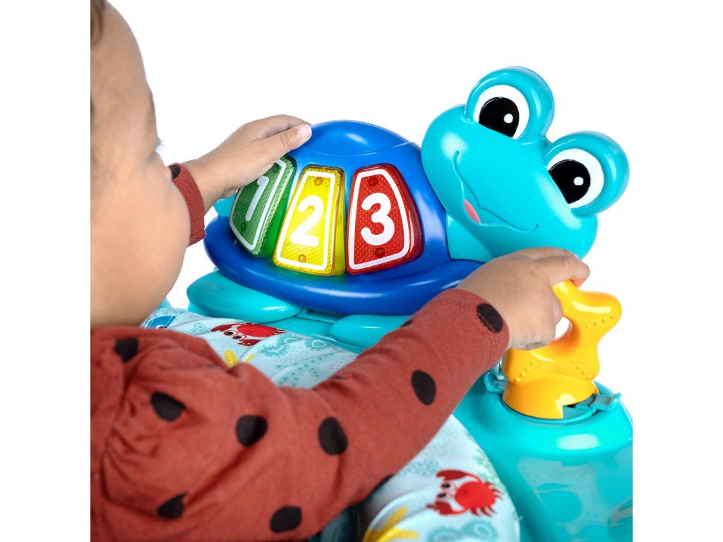 Podporte more učenia so skákadlom 2v1 Baby Einstein Ocean Explorers Curiosity Cove. S otočným sedadlom o 360 stupňov môže bábätko objavovať pohľady a zvuky oceánu zo všetkých strán, zatiaľ čo skáče, skúma a hrá sa s týmto skákadlom s motívom oceánu a odnímateľnou hračkou. Tri herné režimy pomáhajú bábätku objavovať melódie, stimulujú zmysly a učia farby a čísla v 4 jazykoch – angličtine, francúzštine, nemčine a španielčine. Melódie a svetielka zapájajú bábätko počas skákania a elektronická hračka Neptune the Turtle (korytnačka Neptún) ponúka ďalšie učenie pri hre na zemi alebo na cestách. Štyri nastaviteľné výšky jednoducho prispôsobia skákadlo rastúcemu bábätku, čím mu poskytnú bezpečný priestor na objavovanie a hranie od 6 mesiacov do 1 roka alebo do 11,3 kg.Vlastnosti