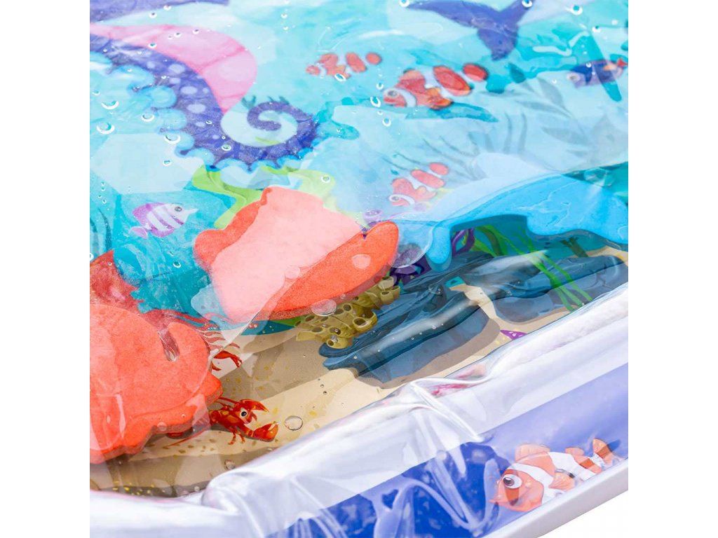 Jedinečná interaktívna podložka vyrobená z kvalitného materiálu, ktorý zaručuje mimoriadnu odolnosť. Okraj podložky nafúknite a do stredu napustite vodu. Vnútri je 5 farebných vodných živočíchov, ktoré sa pod váhou dieťaťa budú pohybovať v priestore naplnenom vodou. Počas hrania na podložke sa dieťa učí používať rôzne svalové partie na udržanie rovnováhy a samostatnému pohybu. Zvyšuje tým silu a vytrvalosť nôh, paží, brucha a chrbta. Potom, čo sa dieťa dohrá, vylejte vodu a vypustite.