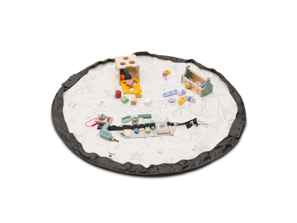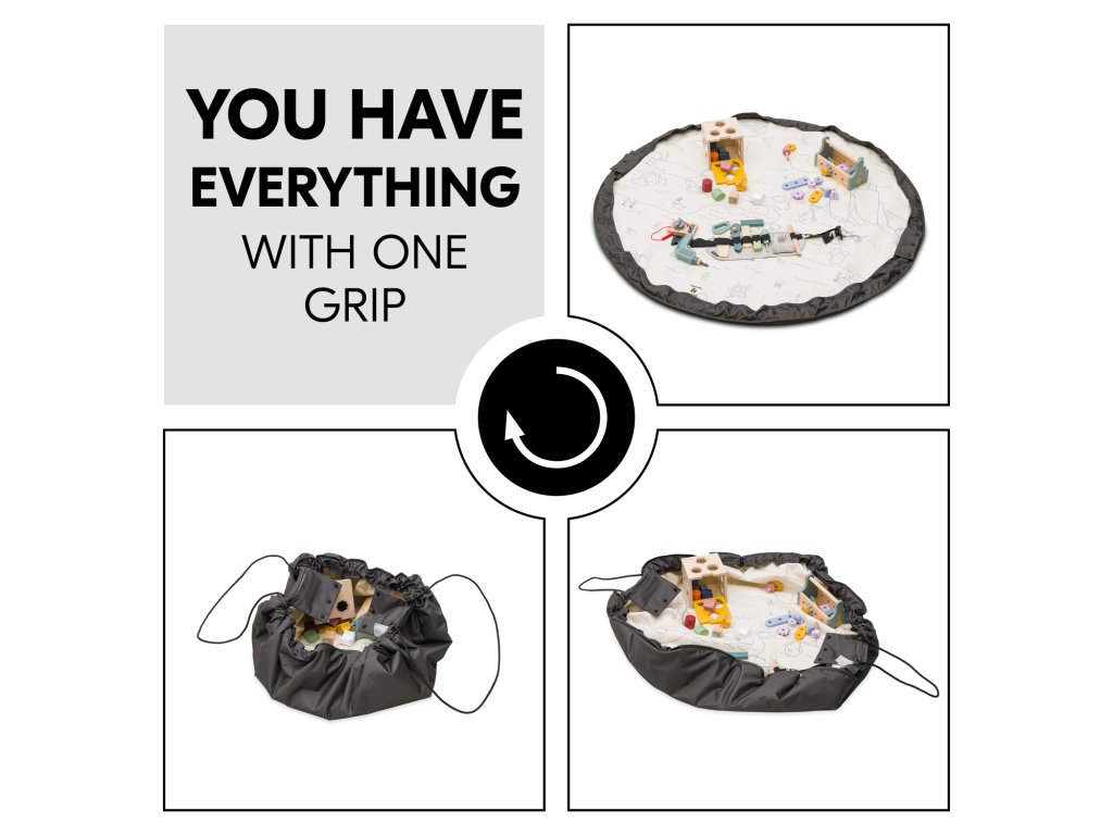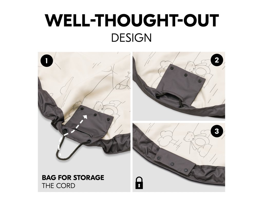 Hra sa skončila, je čas upratať. Zabudnite na zdĺhavé a nezáživné upratovanie. Stačí jeden pohyb a zatiahnutie za pevnú šnúru a z hracej podložky sa zrazu stane praktická taška na uskladnenie hračiek všetkého druhu.