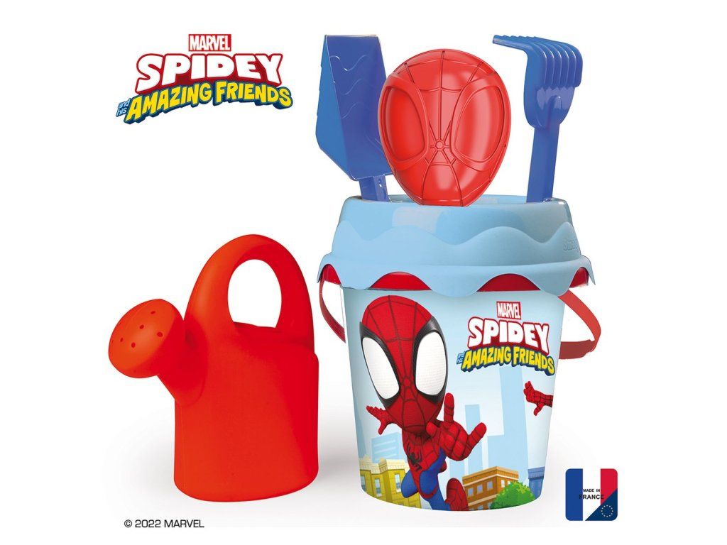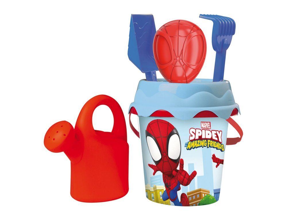 Vedierko na piesok Spidey. Súčasťou je krhlička, hrabličky, lopatka, formička v tvare Spidey masky a sitko. Priemer vedierka 17 cm. Vek 18m+Dodatočné parametre
