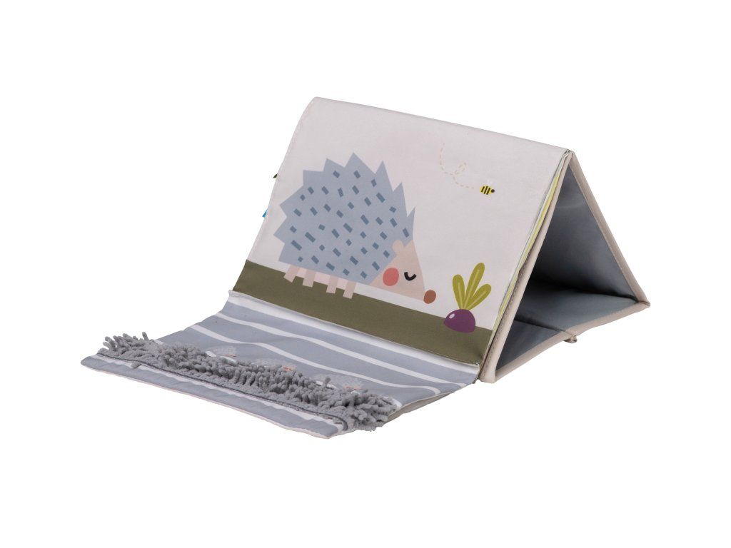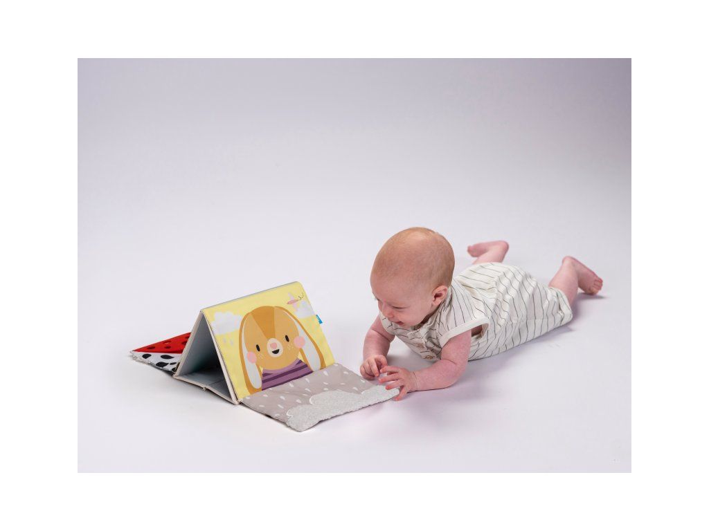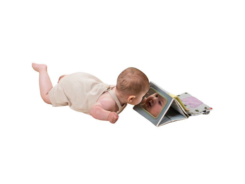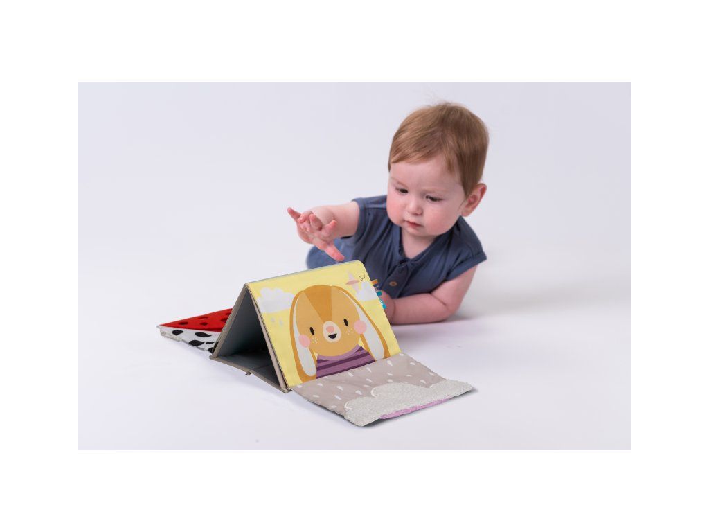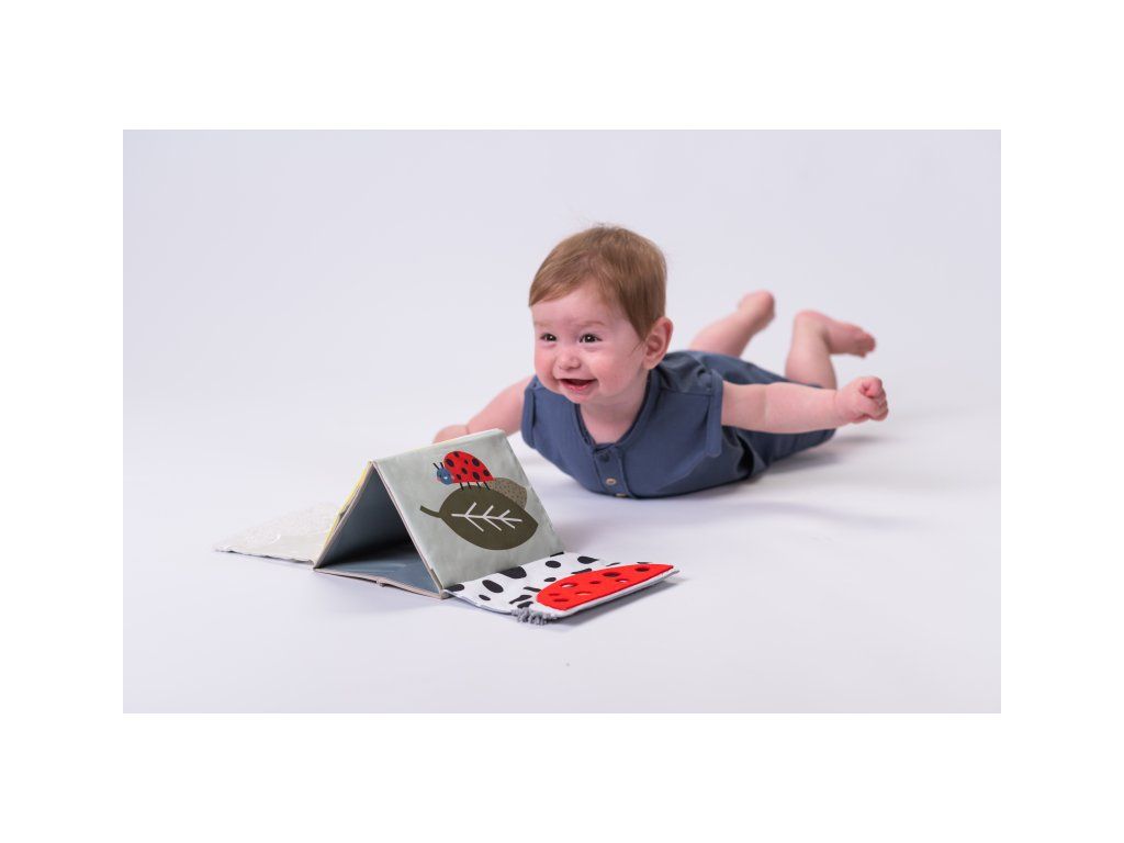 Textilná knižka v tvare stolného kalendára s vysoko kontrastnými obrázkami je ideálna pre postavenie pred dieťa pri hre na brušku. Výrazné obrázky, bezpečné veľké zrkadlo i šuštivé elementy upútajú pozornosť dieťaťa a pomáhajú tak zabaviť dieťa pri hre na brušku.