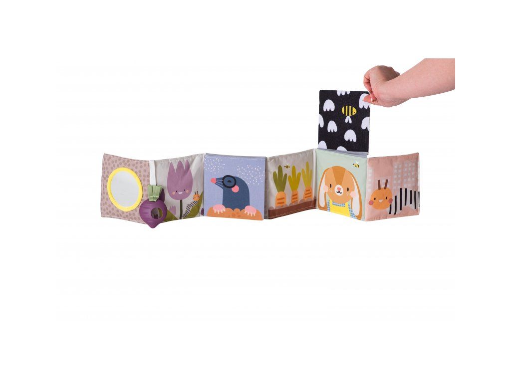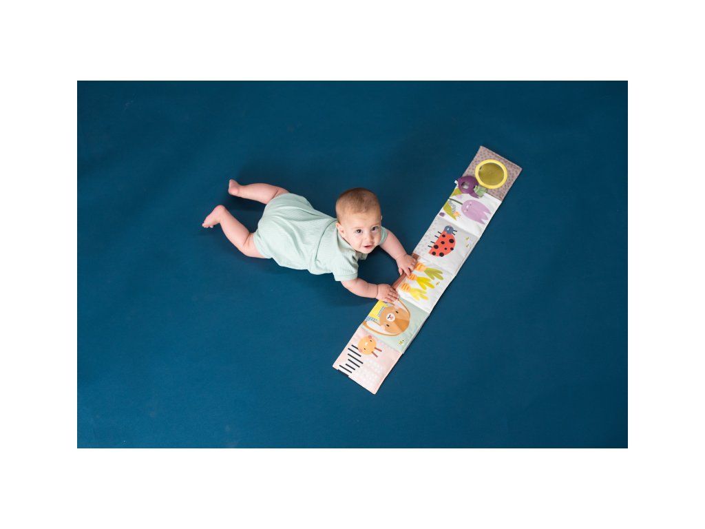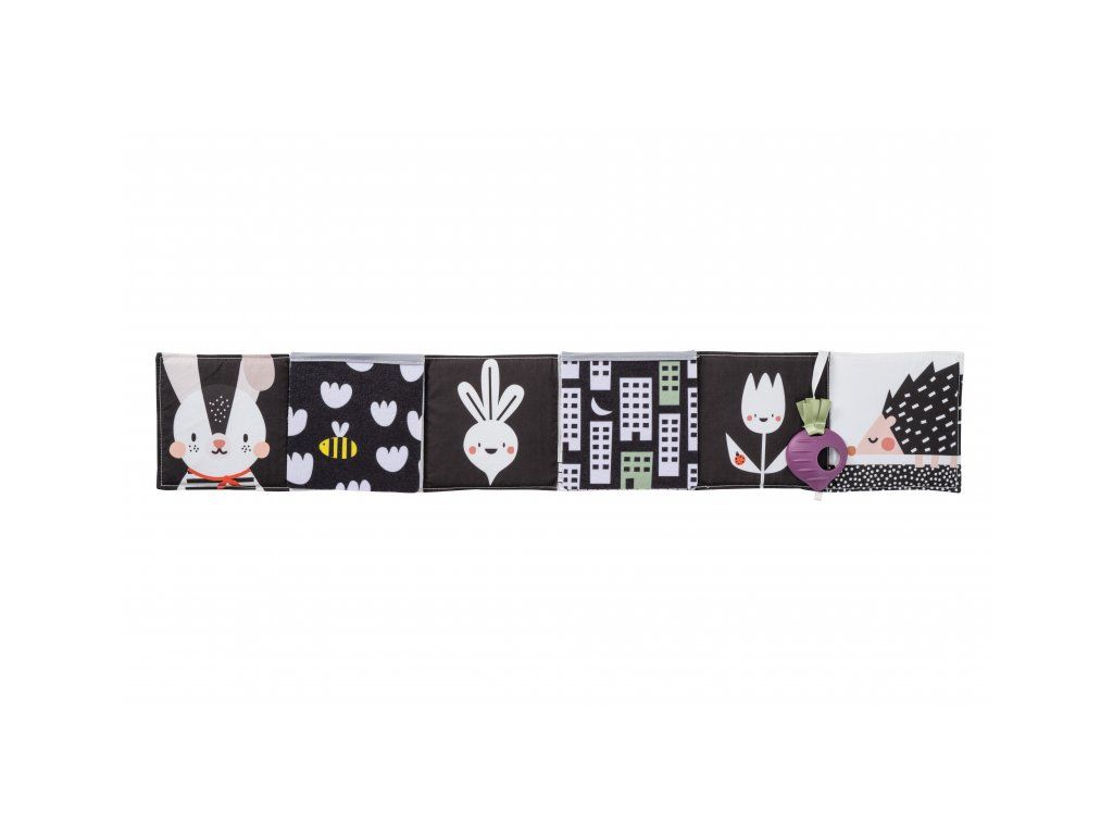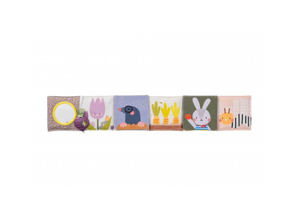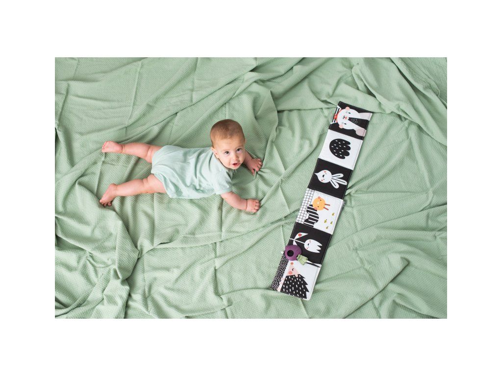 Knižka drží postavená samostatne pre hru na brušku alebo je možné ju pripevniť pomocou plastových klipov na postieľku či do kočíka.