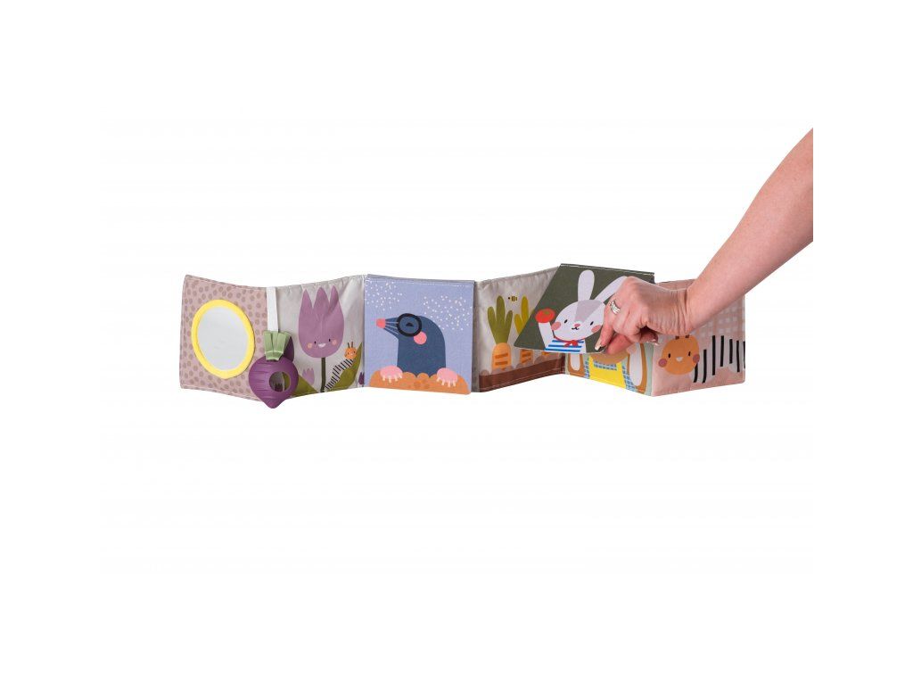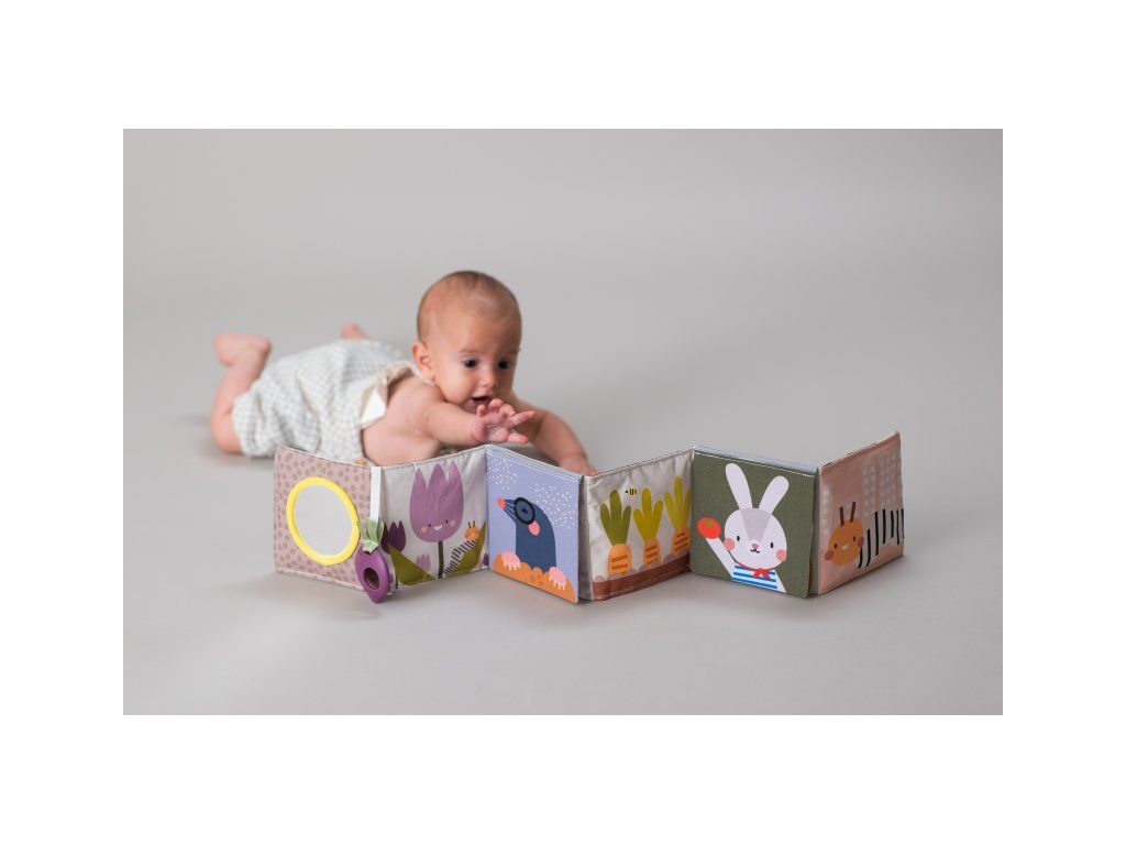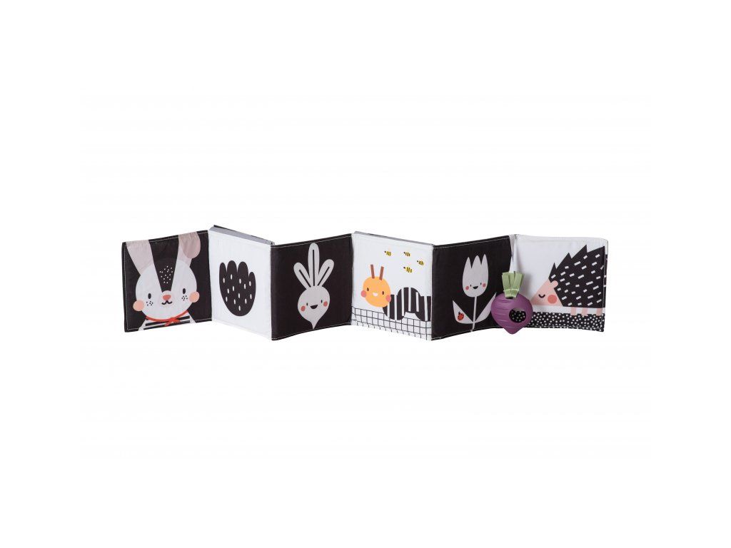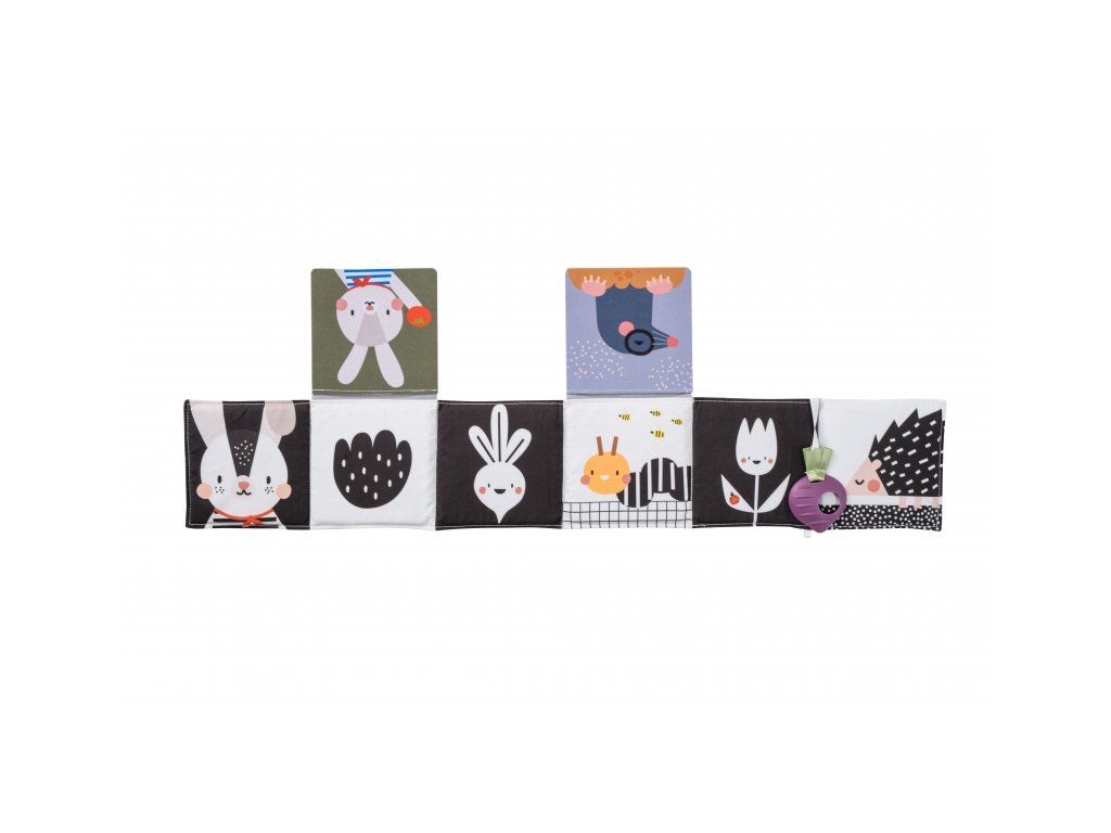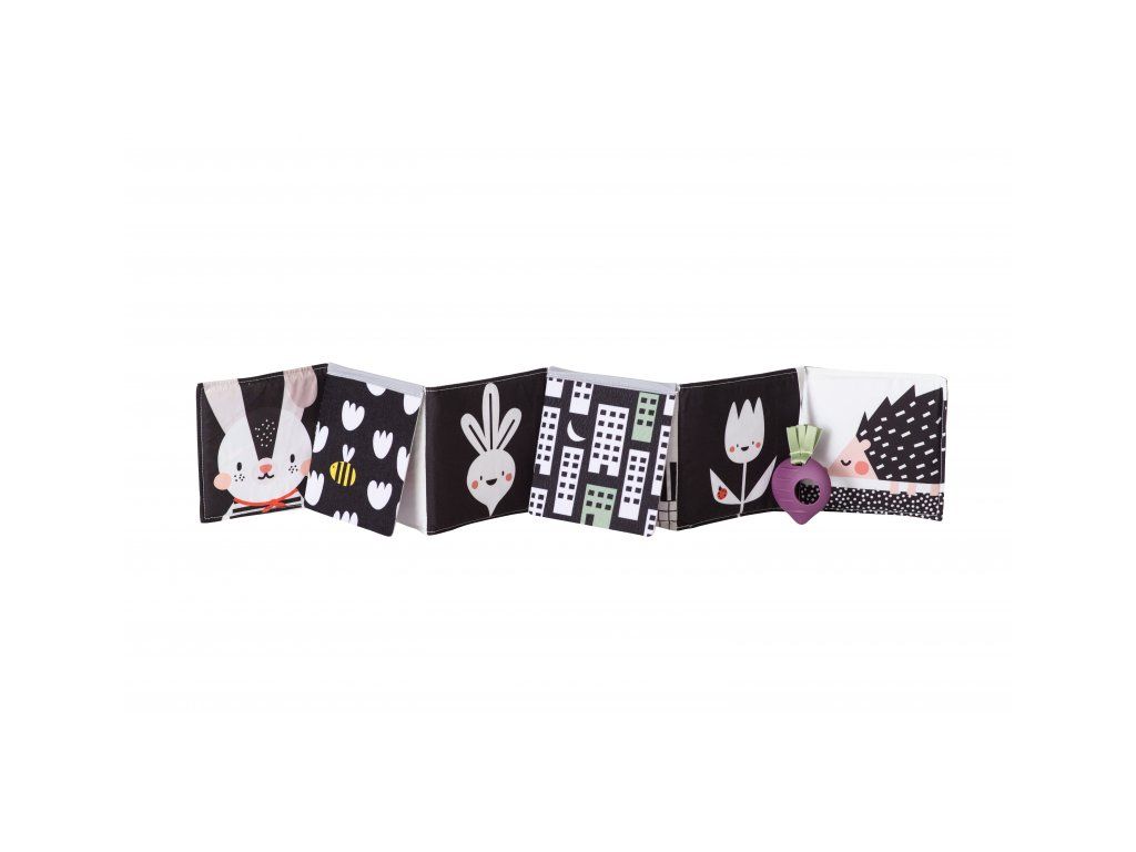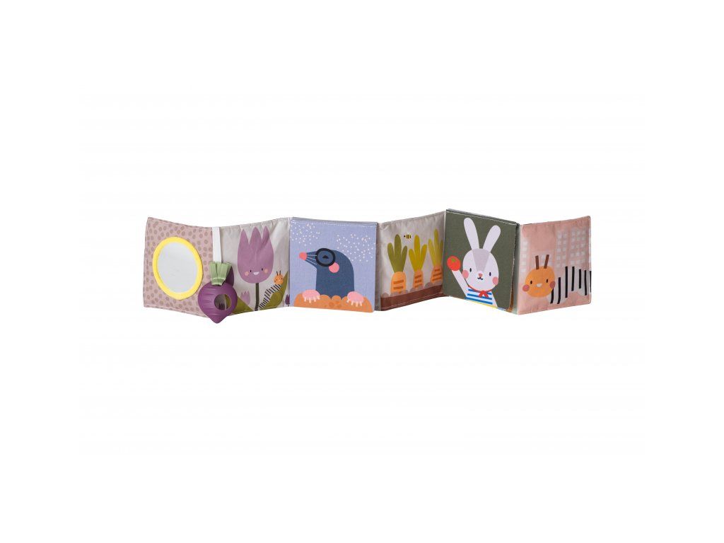 Knižka drží postavená samostatne pre hru na brušku alebo je možné ju pripevniť pomocou plastových klipov na postieľku či do kočíka.