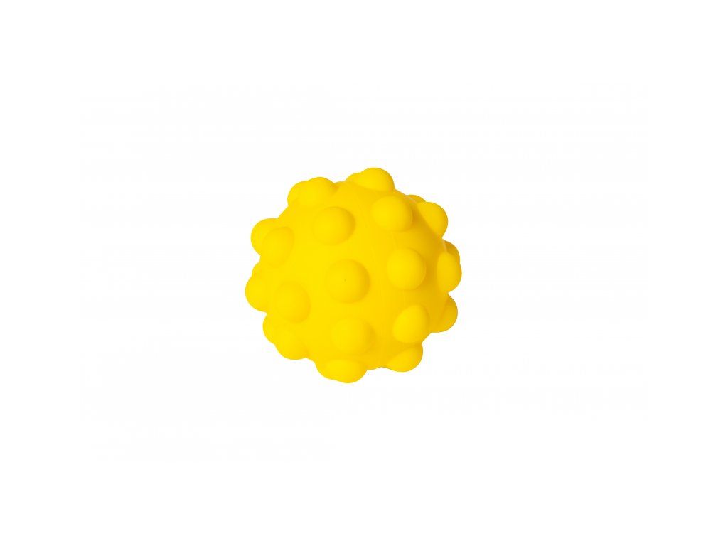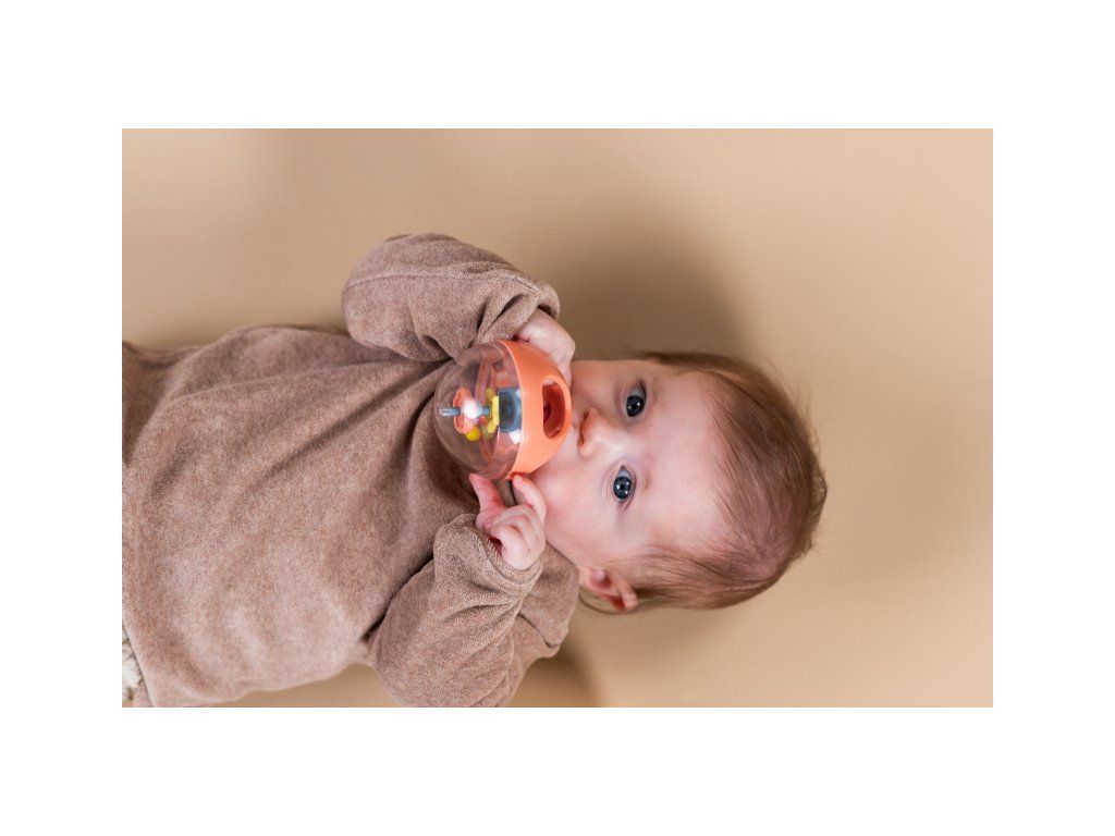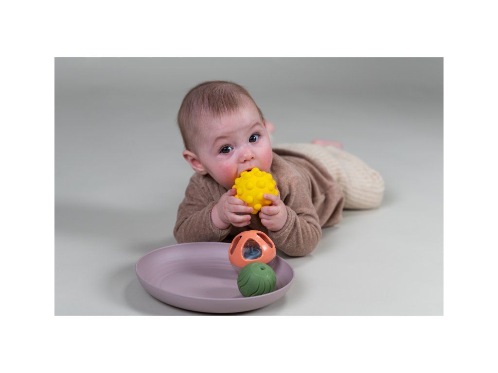 Tri senzorické loptičky - priehľadná s korálkami, žltá s výstupkami a zelená s textúrou - lákajú na skúmanie rukami aj ústami. Podnos so zvýšenými okrajmi umožňuje umiestniť loptičky pred dieťa bez toho, aby sa mu rozkotúľali.