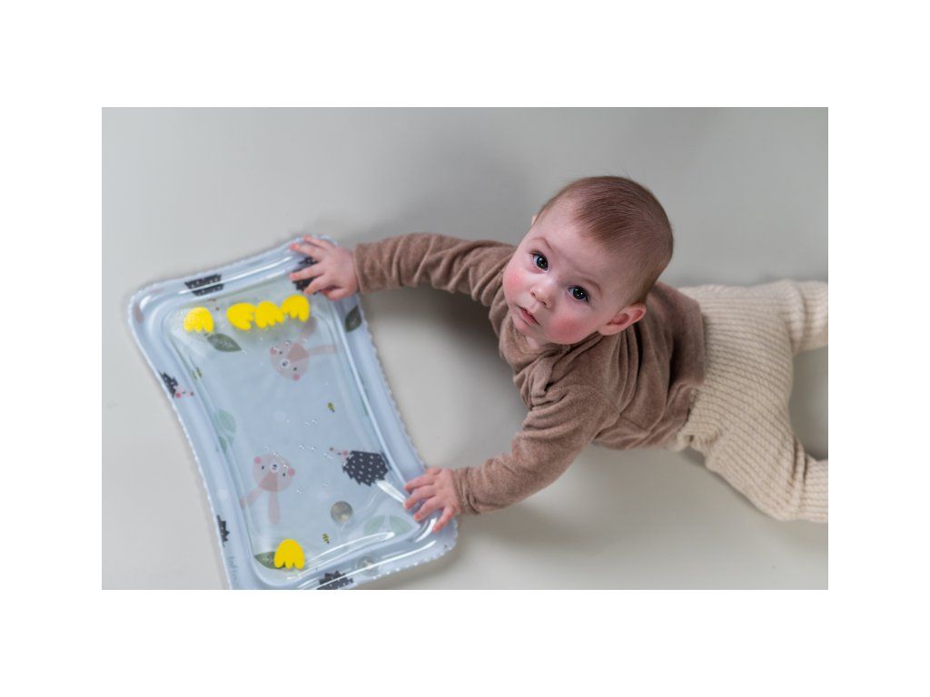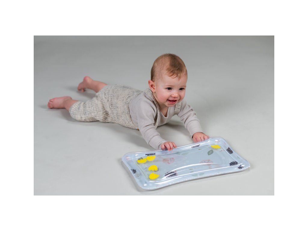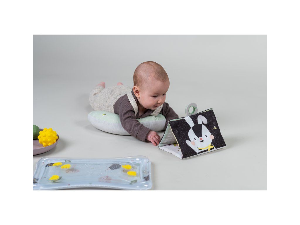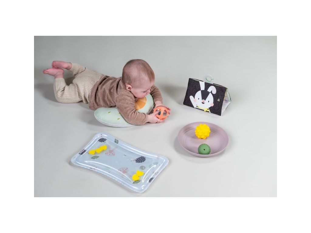 Vankúšik z mäkkého, príjemného materiálu je špeciálne navrhnutý, aby podporoval hranie dieťaťa na brušku.Obojstranná šuštiaca kniha je ideálna pre postavenie pred dieťa v polohe na brušku. Množstvo obrázkov, ktoré kniha ponúka, umožňuje rodičom obrázky vymieňať a udržiavať tak dlhšie pozornosť dieťaťa. Hru na brušku podporuje aj vodná hracia podložka s výraznými žltými kvetmi, ktoré sa vo vode pri stlačení podložky pohybujú a upútavajú tak pozornosť dieťaťa.