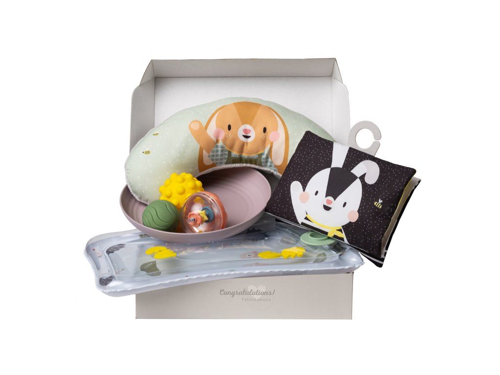 Darčekový box obsahuje špeciálne navrhnutú sadu hračiek pre novorodencov, ktoré zabavia dieťa pri hre na brušku a podporujú rozvoj jednotlivých zmyslov a motorických zručností dieťaťa. Hračky súčasne pomáhajú rozvíjať emocionálnu inteligenciu dieťaťa.