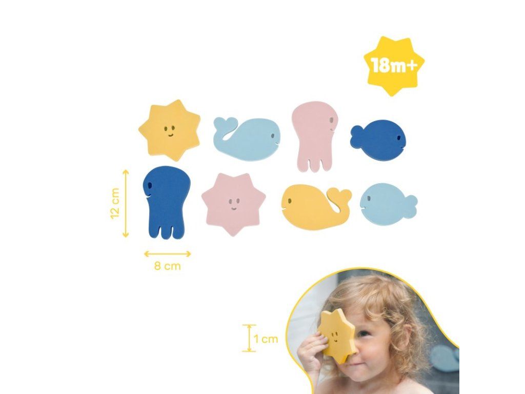 - 8ks penových puzzle, ktoré plávajú na vode a držia na stenách vane či sprchového kúta