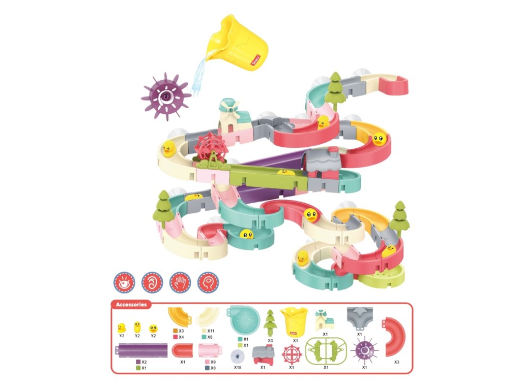 DIY Šmykľavka do vody 86 ksNekonečné vodné dobrodružstváDIY Šmykľavka do vody 86 ks prináša deťom maximálne možnosti pre kreatívnu a zábavnú hru vo vode. Vďaka až 86 dielikom si môžu deti skladať vlastné šmykľavky a dráhy, sledovať pohyb guličiek či malých hračiek vo vode a vytvárať nekonečné kombinácie trás.Súčasťou balenia sú guličky, kačičky, nádoba na vodu aj množstvo doplnkov, ako vodný mlyn, vodné koleso, stromy a domček, ktoré fungujú ako prekážky pre vodu a výrazne obohacujú herný zážitok. Deti môžu usmerňovať tok vody, meniť jej smer a sledovať, ako jednotlivé prvky ovplyvňujú pohyb po dráhe.Táto vodná stavebnica podporuje jemnú motoriku, logické myslenie, tvorivosť aj priestorovú predstavivosť. Šmykľavka je ideálna ako hra do vane, senzorických vaničiek aj na interaktívne aktivity doma či v škôlke. Jednoduché spojenie dielikov umožňuje rýchlo meniť konfigurácie a vytvárať stále nové, pestré vodné dobrodružstvá. Hračka je vhodná pre deti od 3 rokov.Dodatočné parametre