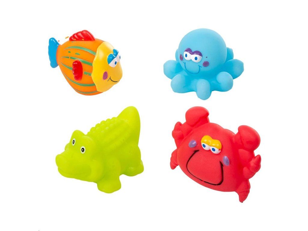 Farebné hračky do kúpeľa Akuku. Sada 4 roztomilých farebných hračiek - rybička, korytnačka, krab, chobotnica. Ideálne na hranie vo vani. Veselé farby priťahujú pozornosť našich najmenších. Každá hračka má otvor, cez ktorý môže striekať voda. Zaoblené tvary zaručujú bezpečnosť počas hry. Vyrobené z bezpečných, vysoko kvalitných materiálov, neobsahujú bisphenol A. Výška hračiek 4 až 6 cm.Dodatočné parametre
