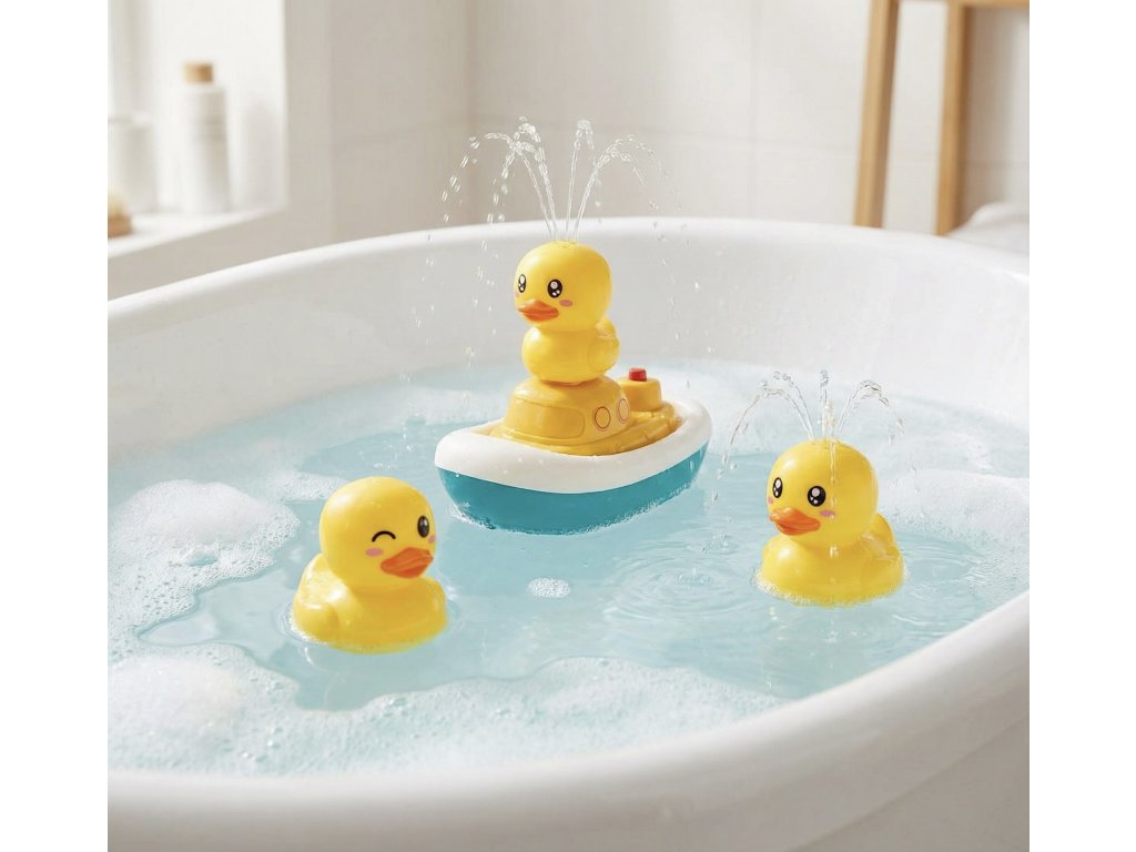 Plávajúca loďka s kačičkamiHra, ktorú si deti zamilujúPlávajúca loďka s kačičkami prinesie deťom do kúpeľne poriadnu dávku vodnej zábavy. Súčasťou balenia je jedna loďka a tri kačičky, ktoré sa pri zapnutí alebo po kontakte s vodou môžu otáčať a striekať vodu, čím vytvárajú efekty fontánky alebo vodného kruhu okolo seba. Deti môžu loďku naháňať po hladine, pozorovať prúdy vody a vymýšľať si vlastné vodné príbehy.Sada podporuje spoluprácu aj predstavivosť, keď si deti vymýšľajú hry s viacerými kačičkami. Hračka je vhodná pre deti od 3 rokov, funguje na batérie, ktoré nie sú súčasťou balenia. Loďka aj kačičky sú vyrobené z kvalitného plastu s hladkými hranami a sú vhodné do vane aj menšieho bazéna, takže deti ich môžu používať doma aj vonku.Nevhodné pre deti do 3 rokov. Používať len pod priamym dohľadom dospelej osoby.Dodatočné parametre