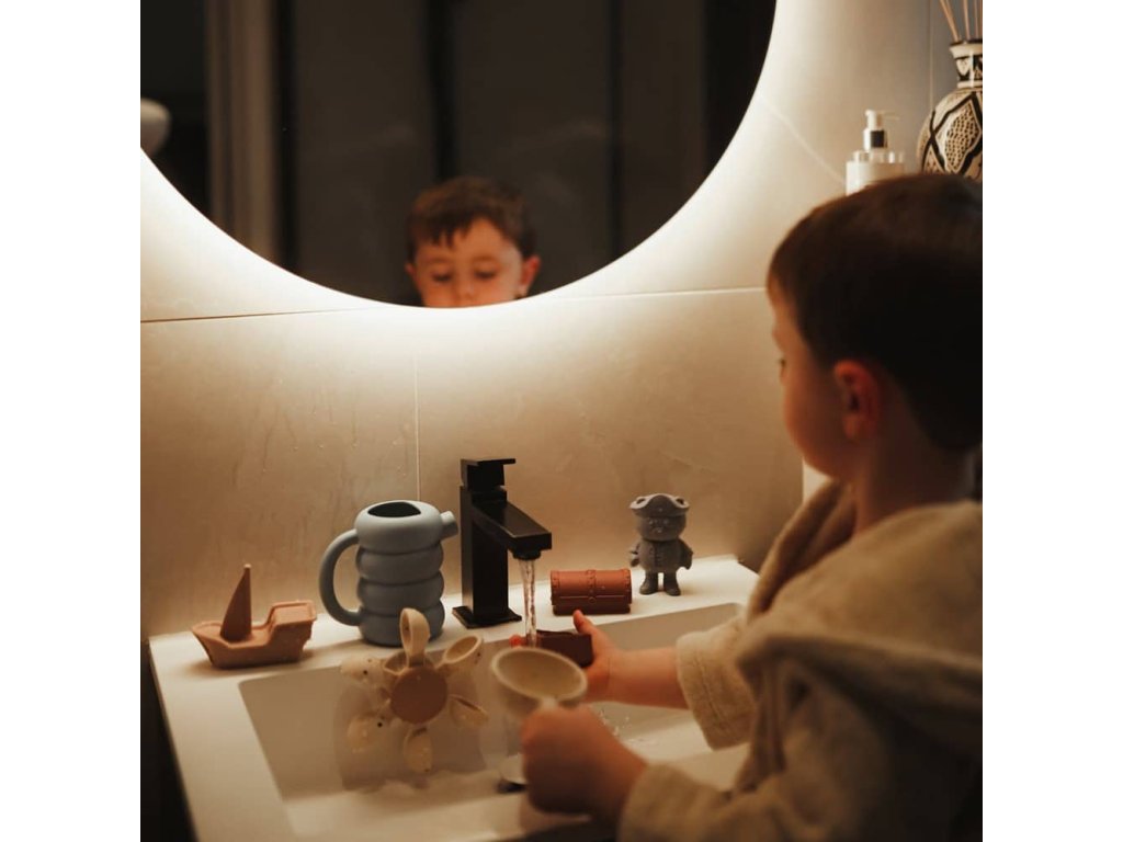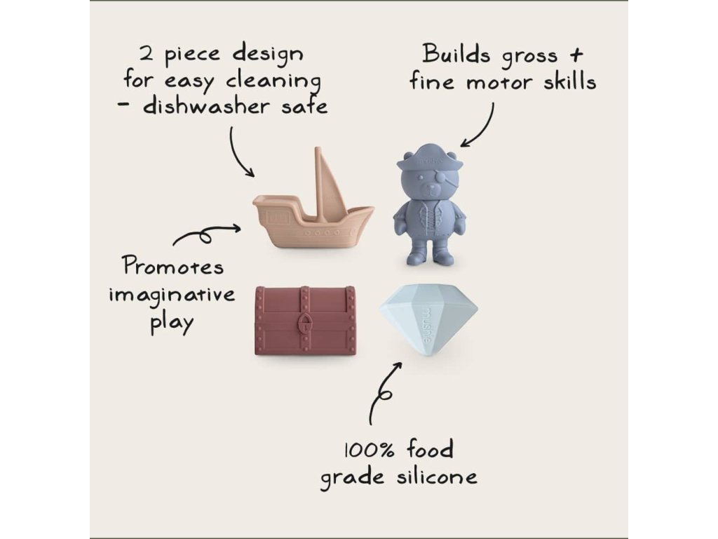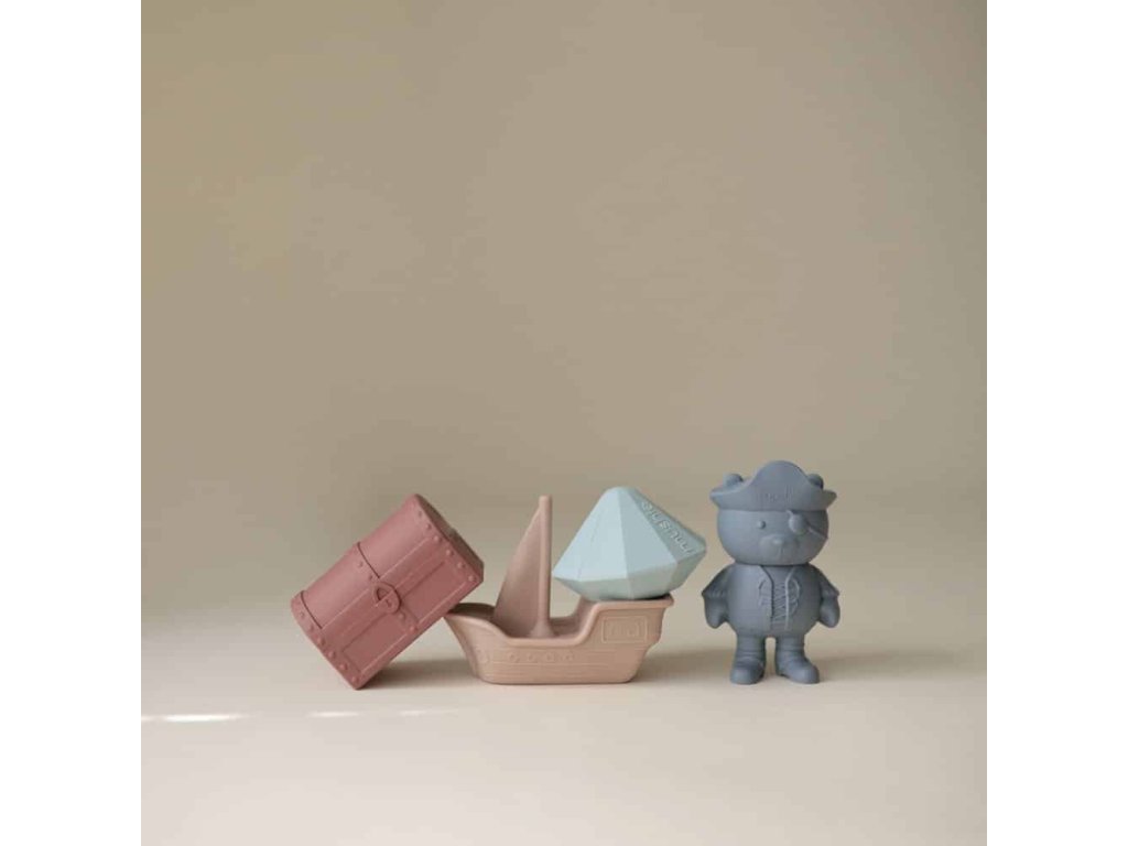 Hračky sú vyrobené z potravinárskeho silikónu, ktorý je mäkký a ľahko uchopiteľný pre malé detské ruky – či už suché alebo mokré. Hravá pirátska tematika podporuje zvedavosť a predstavivosť dieťaťa a premieňa kúpanie na zábavný a pútavý zážitok.